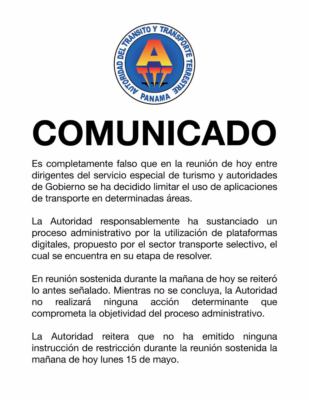 El director de la Autoridad de Tránsito y Transporte Terrestre Julio González en su cuenta de Twitter informó que no se tomó ninguna decisión con respecto a la operación de la plataforma Uber.