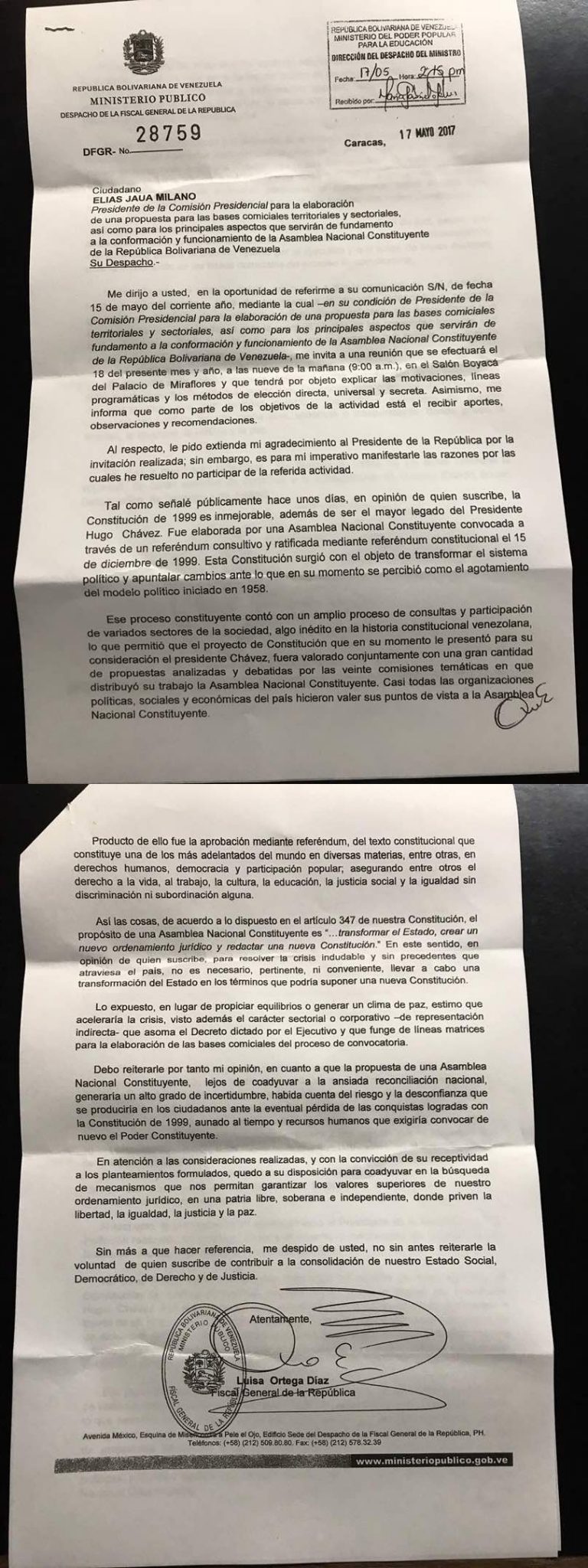 la Fiscal General de la República Bolivariana de Venezuela, Luisa Ortega Díaz, responde a la invitación realizada por el Presidente Nicolás Maduro a participar de la elaboración de bases comiciales para Asamblea Nacional Constituyente