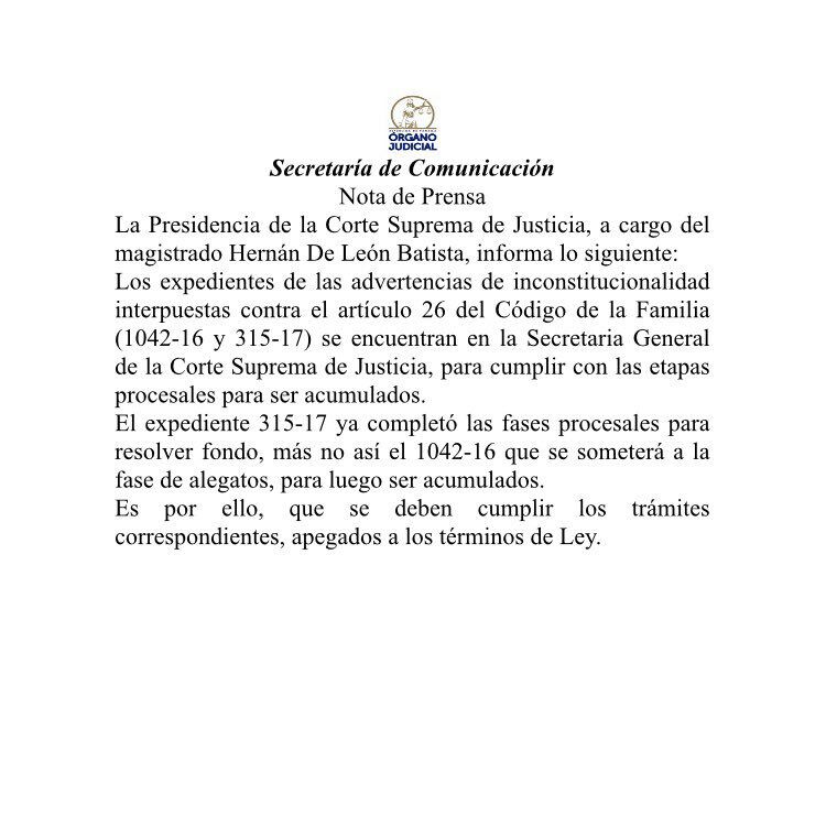 El presidente de la Corte Suprema de Justicia el magistrado Hernán de León Batista informó que los expedientes de las advertencias de inconstitucionalidad interpuestas contra el artículo 26 del Código de la Familia se encuentran en la secretaría general de la Corte Suprema de Justicia para cumplir con las etapas procesales y así ser acumulados.