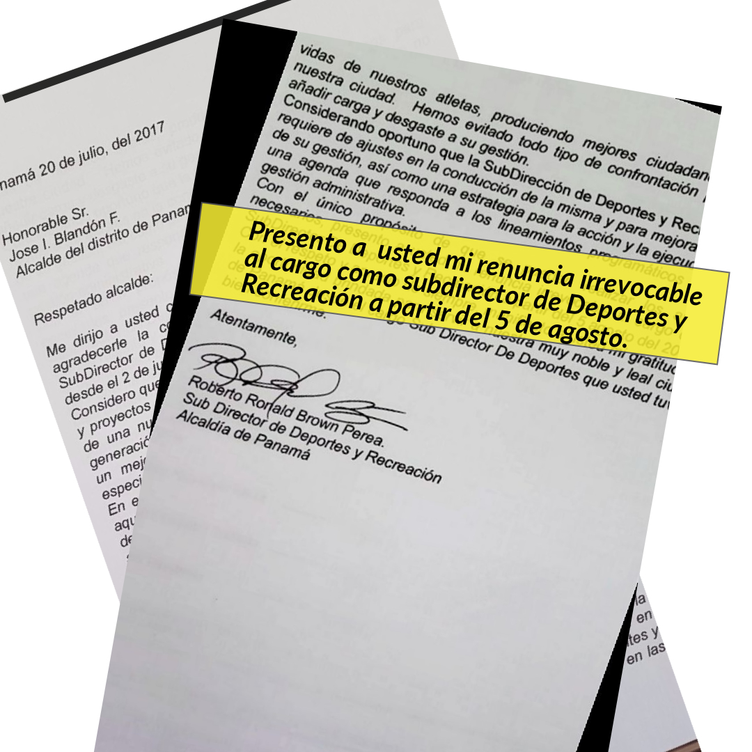 Roberto Brown ha decidido dar un paso al lado en la formación del equipo de trabajo en la Alcaldía de Panamá. Según una carta entregada al propio Alcalde José Blandón, su salida se da esperando que se facilite en el municipio capitalino completar los “ajustes que necesiten para reestructurar la Subdirección de Deportes”; una oficina que estuvo bajo la conducción del deportista desde julio de 2014.