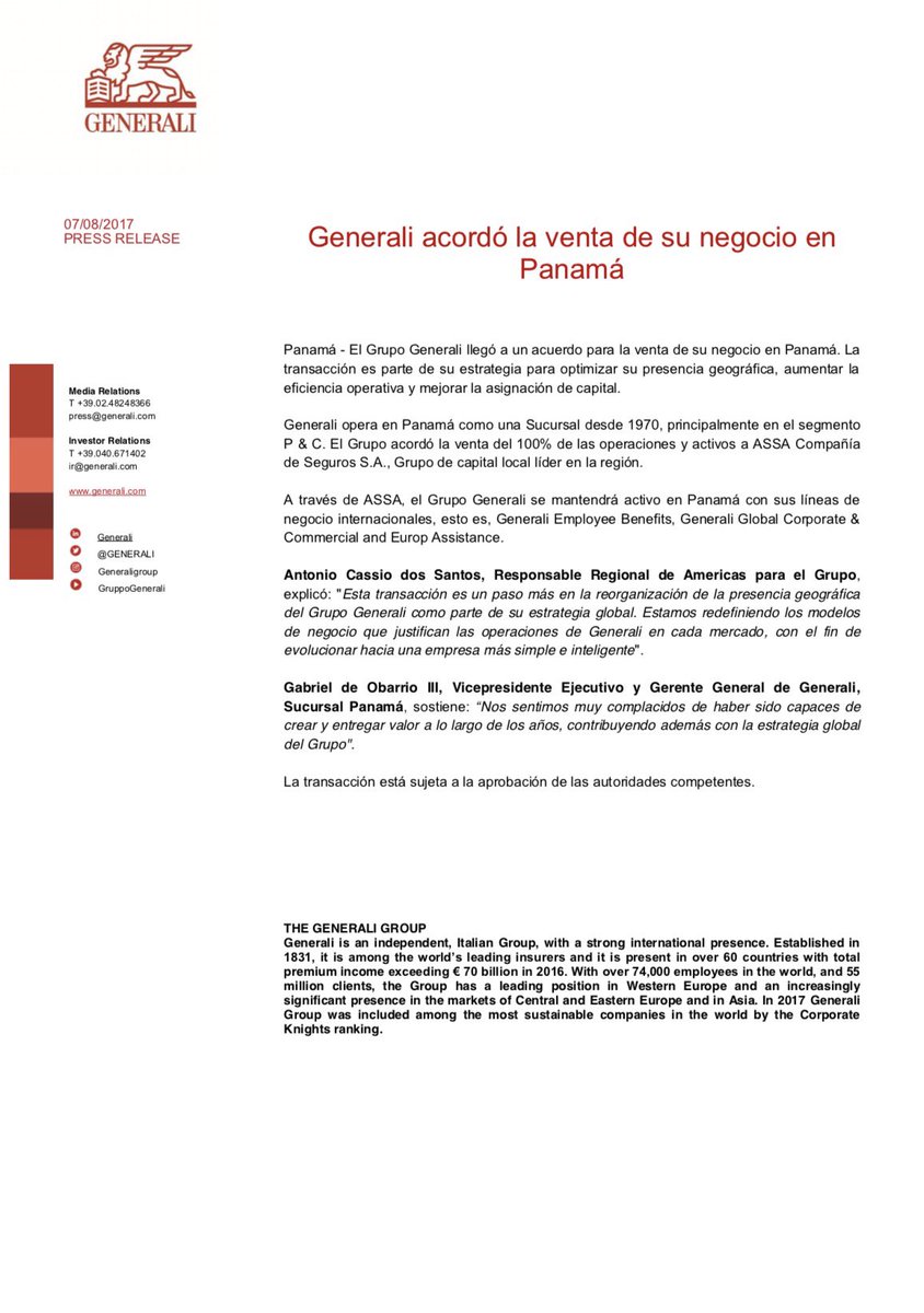 Generali precisó que esta cesión “se inscribe en su estrategia de optimización de su presencia geográfica y la mejora de su eficacia operacional”. Presente en Panamá desde 1970, vende sus activos a Assa Compañía de Seguros por un monto de 172 millones de euros.