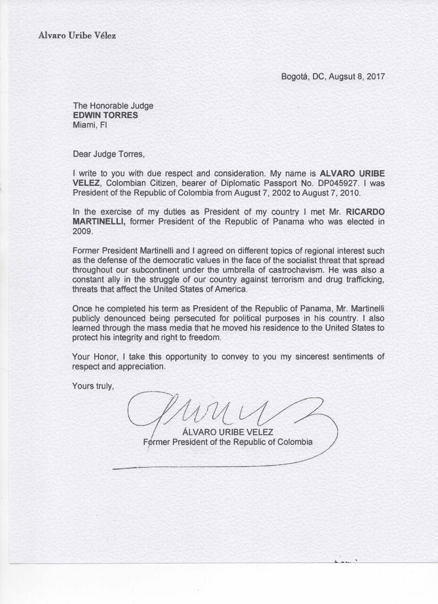 El ex presidente de Colombia, Alvaro Uribe, escribió al juez Edwin Torres, quien está a cargo del juicio de extradición de Martinelli en Miami, destacando referencias positivas del ex presidente a través de una misiva
