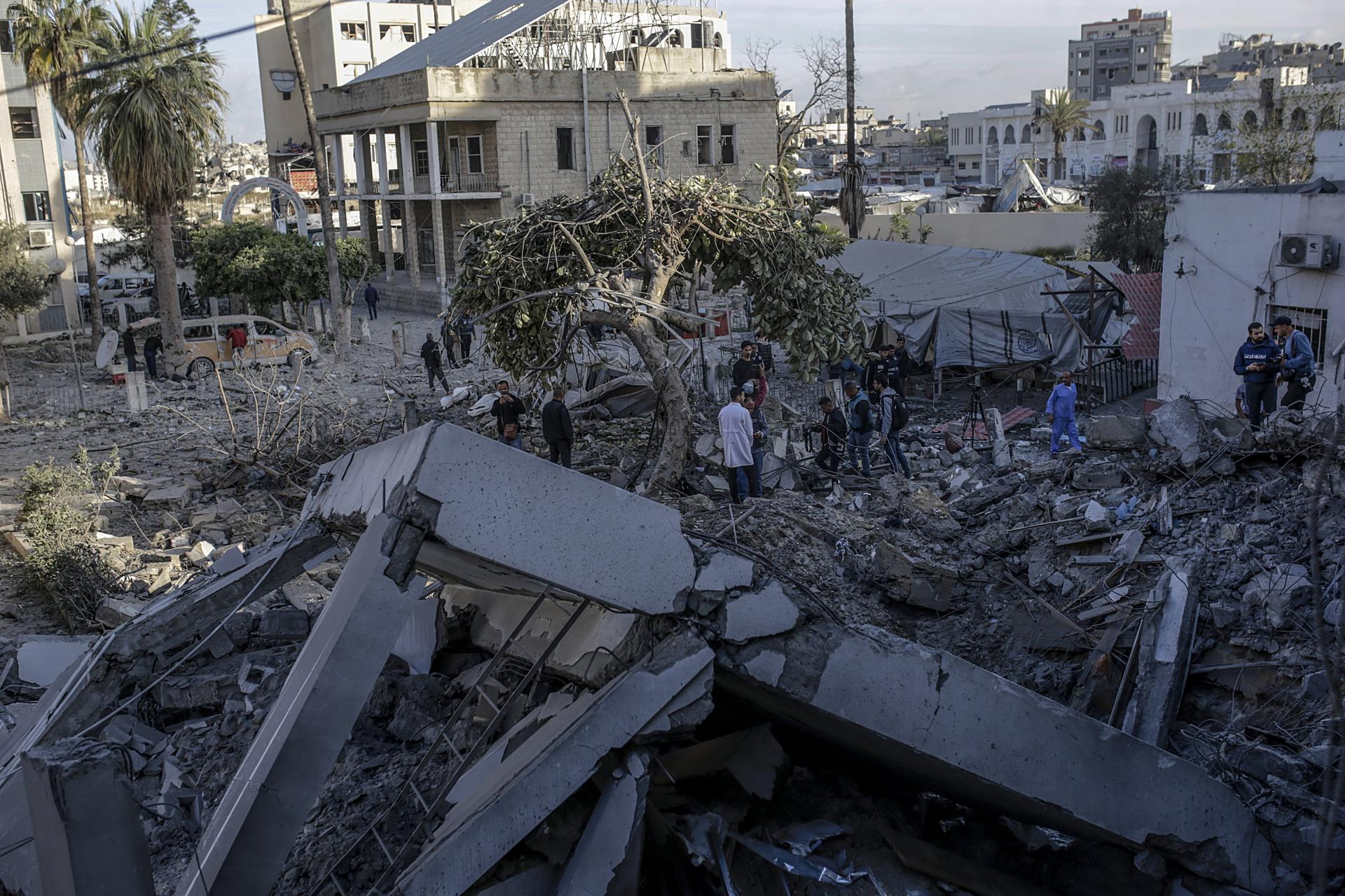 Palestinos inspeccionan el edificio destruido del hospital Al Ahli, también conocido como hospital Bautista, tras el ataque aéreo israelí en la ciudad de Gaza, el 13 de abril de 2025. EFE/EPA/MOHAMMED SABER