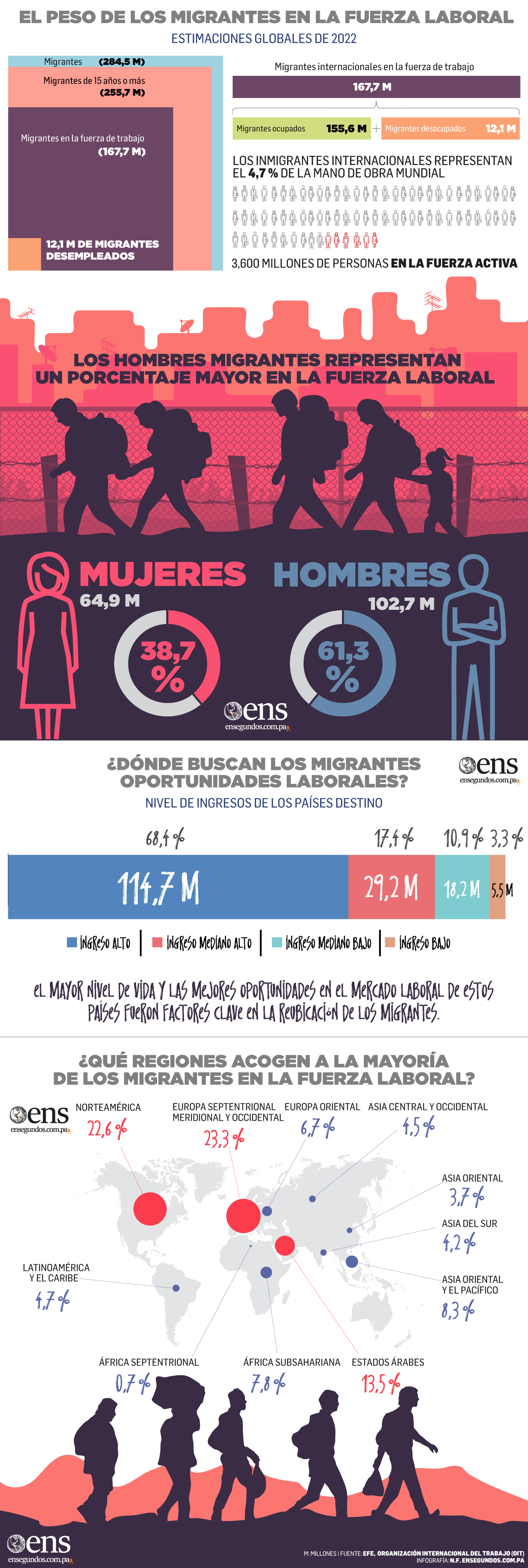 Cintillo, Infografía Trabajadores migrantes componen cerca del 5 % de la fuerza laboral mundial Infografia N. Fernández, Ensegundos.com.pa | EFE 19 abril, 2025 Empleo Fuerza Infografia mercado laboral Migrantes OIT Trabajo Foto: Manoj Poosam, Unsplash.com WhatsAppFacebookTwitterGoogle+LinkedInPinterest Cerca del 5 % de la fuerza del mercado laboral en el mundo está formada por trabajadores migrantes, pero en el sector de los servicios su presencia salta al 68 %, según los datos de la Organización Internacional del Trabajo (OIT)