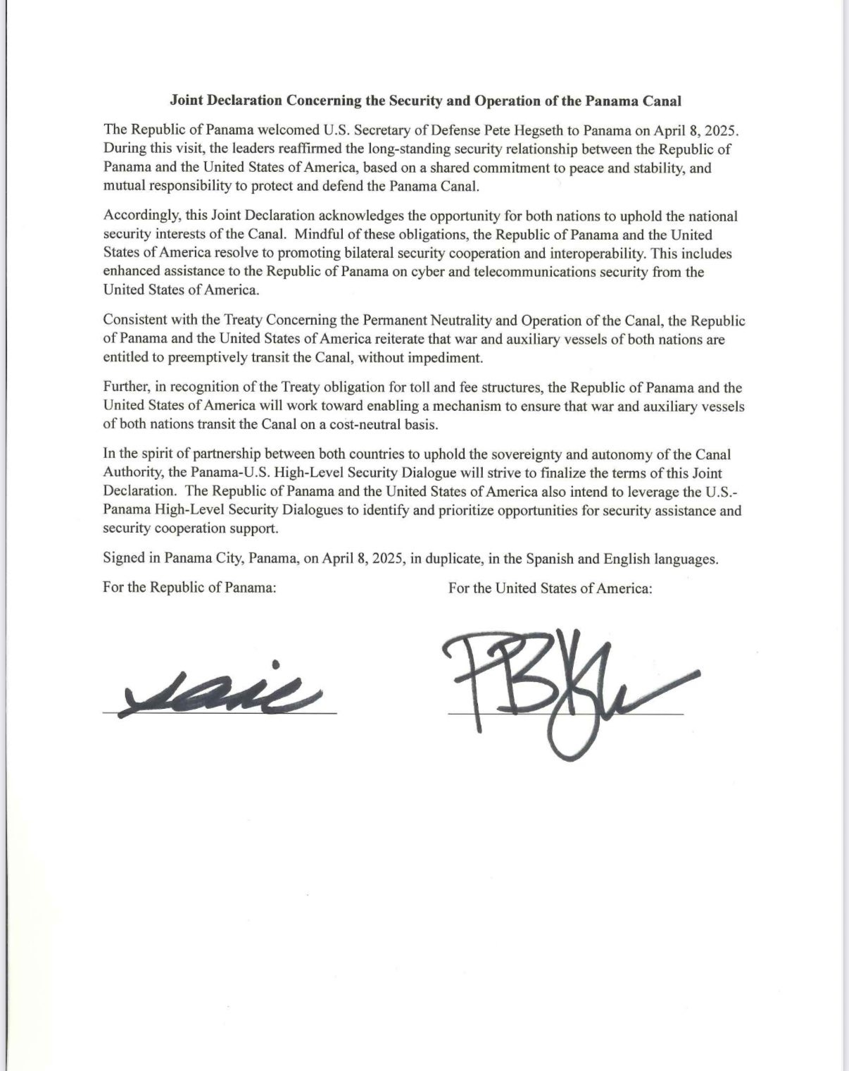 El ministro para Asuntos de Canal, José Ramón Icaza, publicó en sus redes sociales la versión en inglés de la declaración conjunta firmada por él en representación de Panamá y por el secretario de Defensa Pete Hegseth, por Estados Unidos, donde se acuerda buscar un mecanismo que compense o logre un “costo neutral” por el paso de buques de guerra estadounidenses por el Canal.