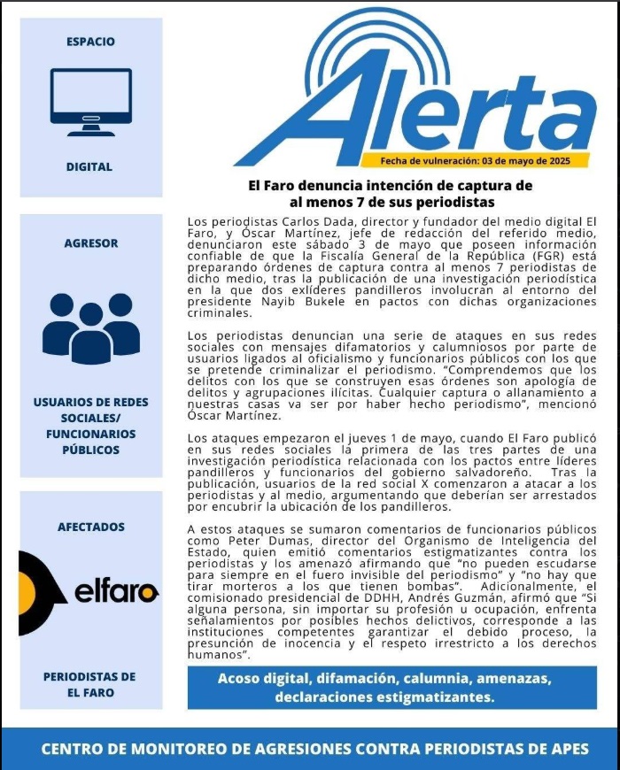 Señaló que el director y el fundador de El Faro, Carlos Dada y Óscar Martínez, respectivamente, “denunciaron el sábado 3 de mayo que poseen información confiable que la Fiscalía está preparando órdenes de captura contra al menos siete periodistas de dicho medio”, de acuerdo con el reporte de la agencia EFE.