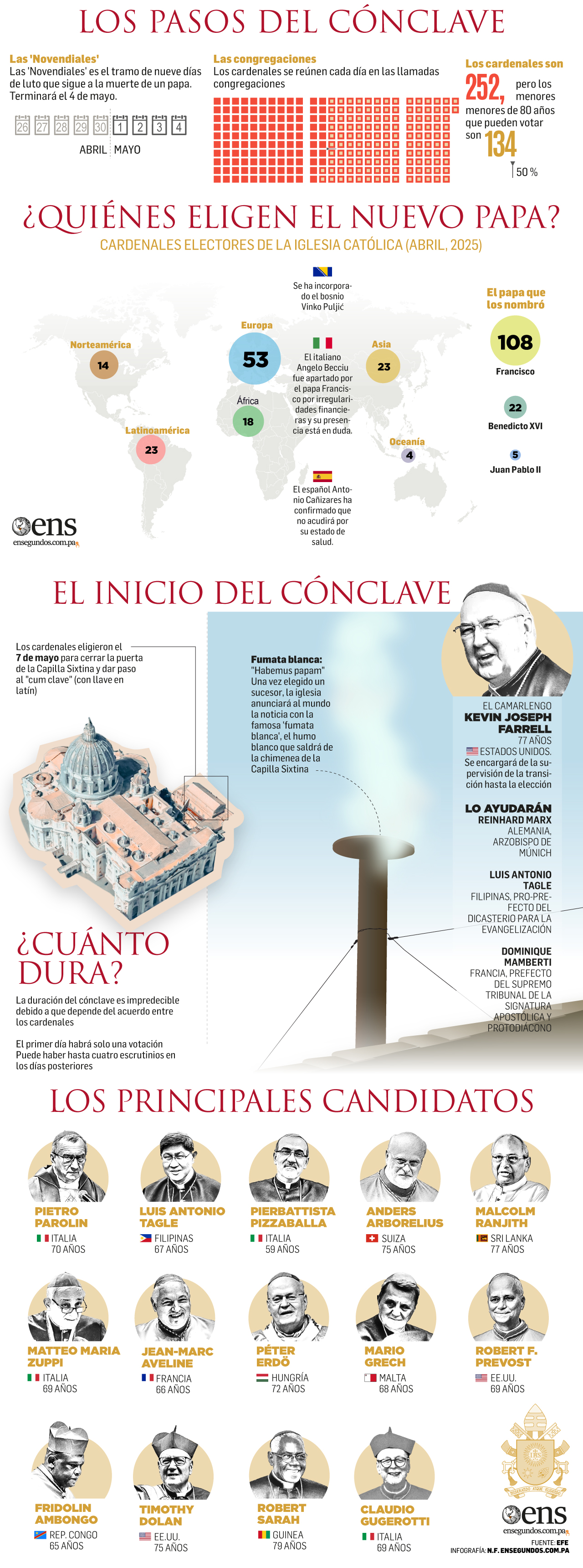 Cintillo, Infografía ¿Cómo será el cónclave en el que se elegirá al sucesor de Francisco? Infografia: N. Fernández, Ensegundos.com.pa | EFE 7 mayo, 2025 cónclave credos Francisco Infografia Líder Papa Religión religioso Ilustracion: N. Fernández WhatsAppFacebookTwitterGoogle+LinkedInPinterest El cónclave para elegir al sucesor de papa Francisco comenzará hoy 7 de mayo en la Capilla Sixtina, según la decisión adoptada este lunes por los cardenales. Así será el proceso para conocer el próximo pontífice de la Iglesia Católica