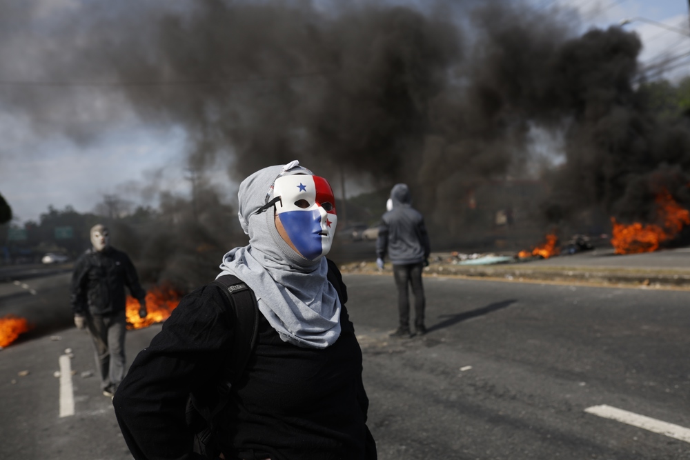 Manifestantes bloquean las calles frente a la Universidad de Pañnamá, durante la huelga nacional convocada por sindicatos de obreros y docentes este viernes. EFE/ Bienvenido Velasco.