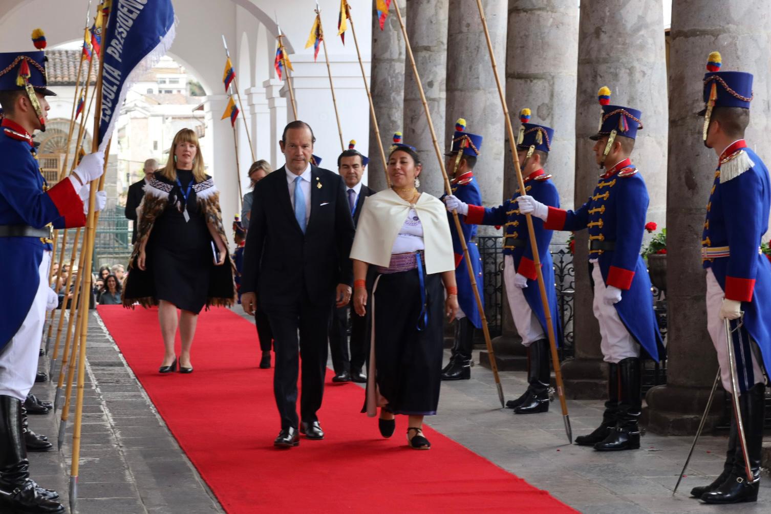 Posteriormente, junto a los jefes de las delegaciones saludó al nuevo mandatario en el Palacio de Carondelet, sede del Gobierno de ese país sudamericano, quien estaba acompañado por la vicepresidenta, María José Pinto.