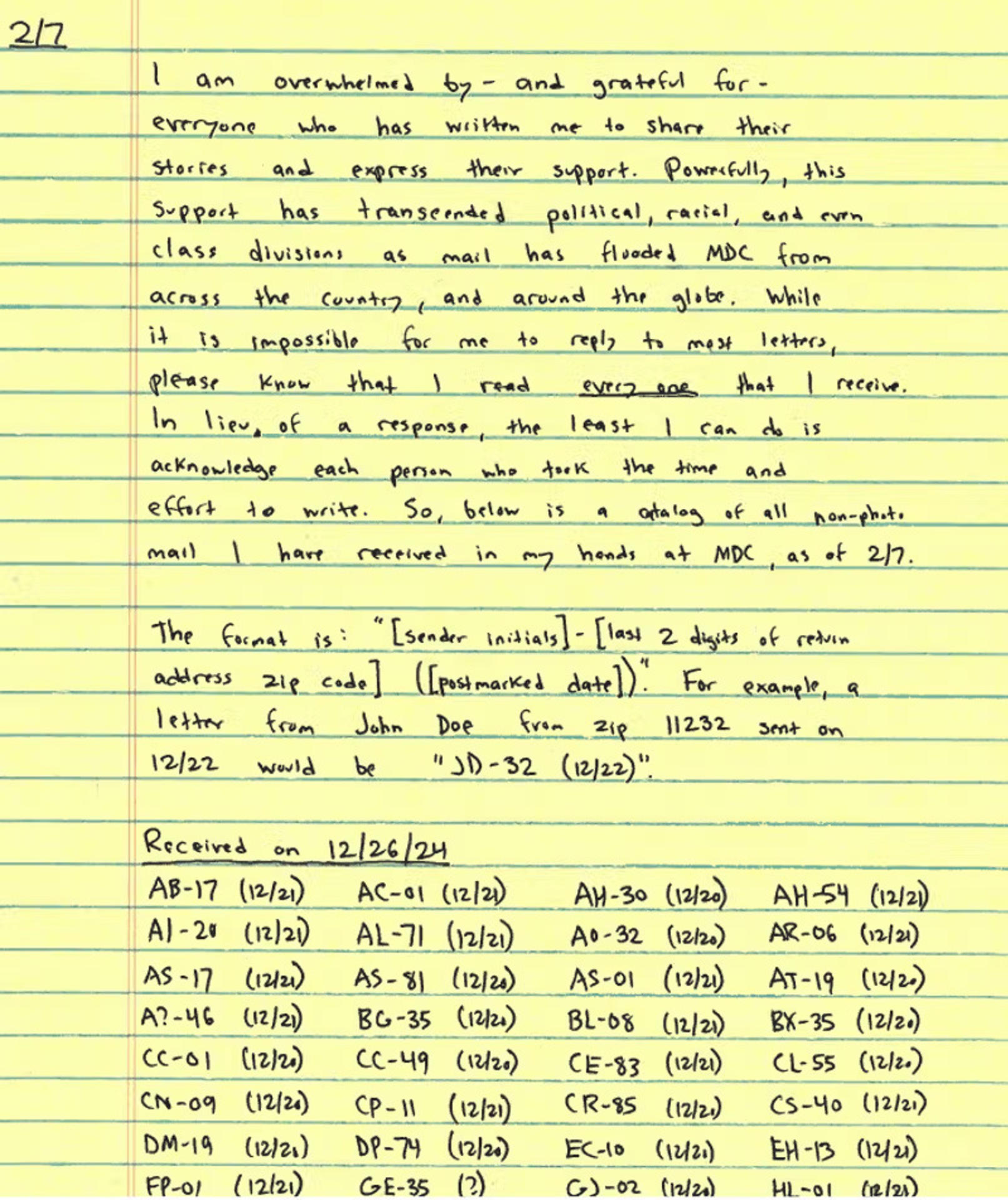 “Me es imposible responder a la mayoría de cartas, pero sepan ustedes que leo cada una de las que recibo”, escribió Mangione, alentando a sus simpatizantes a seguir en contacto: “Espero tener más noticias suyas en el futuro”.