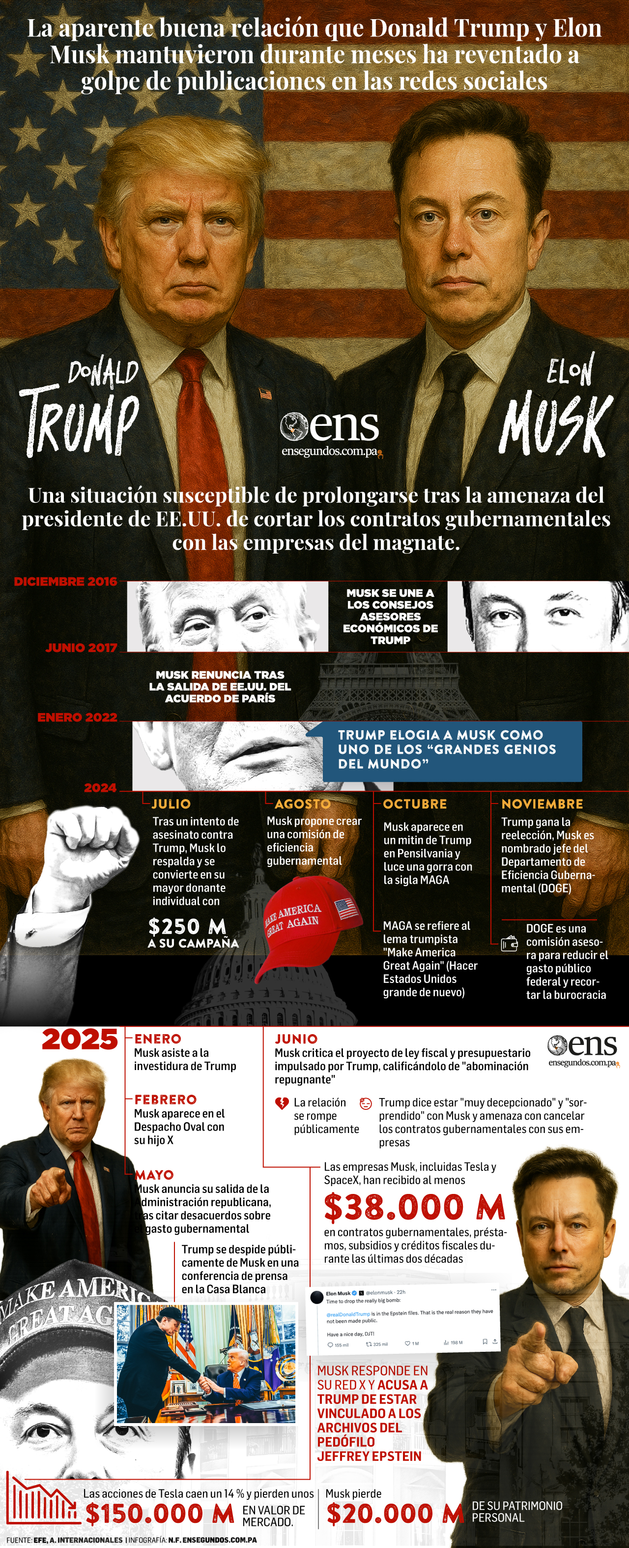 Cintillo, Infografía, Mundo El colapso de la relación entre Donald Trump y Elon Musk Infografia N.F. Ensegundos.com.pa | EFE 14 junio, 2025 Alianza Colapso Donald Elon Infografia Musk relación trump Ilustración: N. Fernández WhatsAppFacebookTwitterGoogle+LinkedInPinterest De una alianza estratégica a una ruptura pública y conflictiva