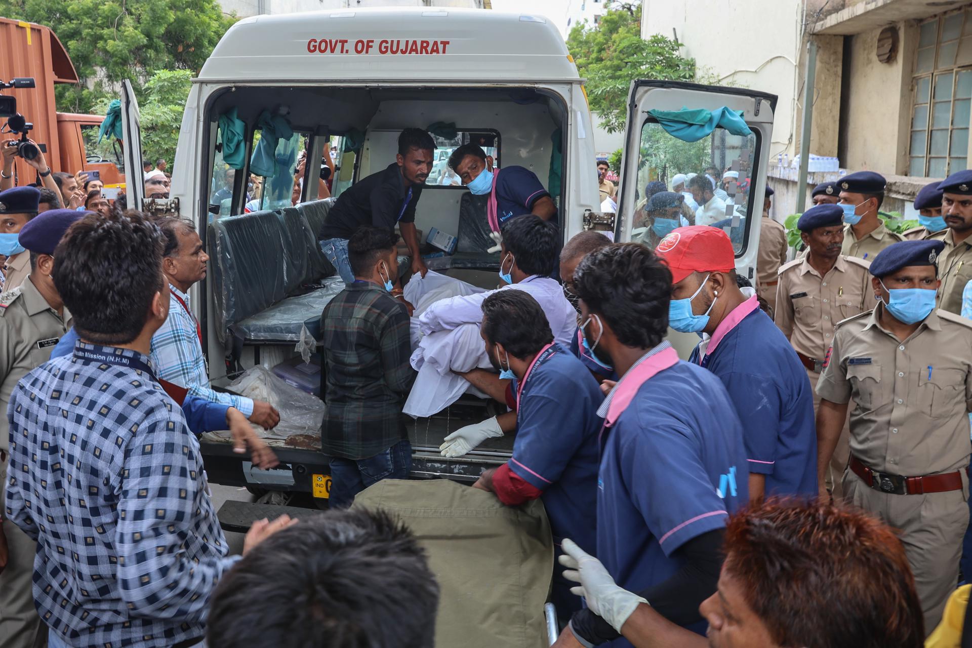 Familiares y personal hospitalario trasladan el cuerpo de una víctima fallecida en un accidente aéreo en Ahmedabad, Gujarat, oeste de la India, el 13 de junio de 2025. El vuelo AI171 de Air India, con destino a Londres y con 242 pasajeros y tripulantes a bordo de un Boeing 787-8, se estrelló minutos después del despegue en la zona de Meghaninagar, en Ahmedabad. (Londres) EFE/EPA/RAJAT GUPTA