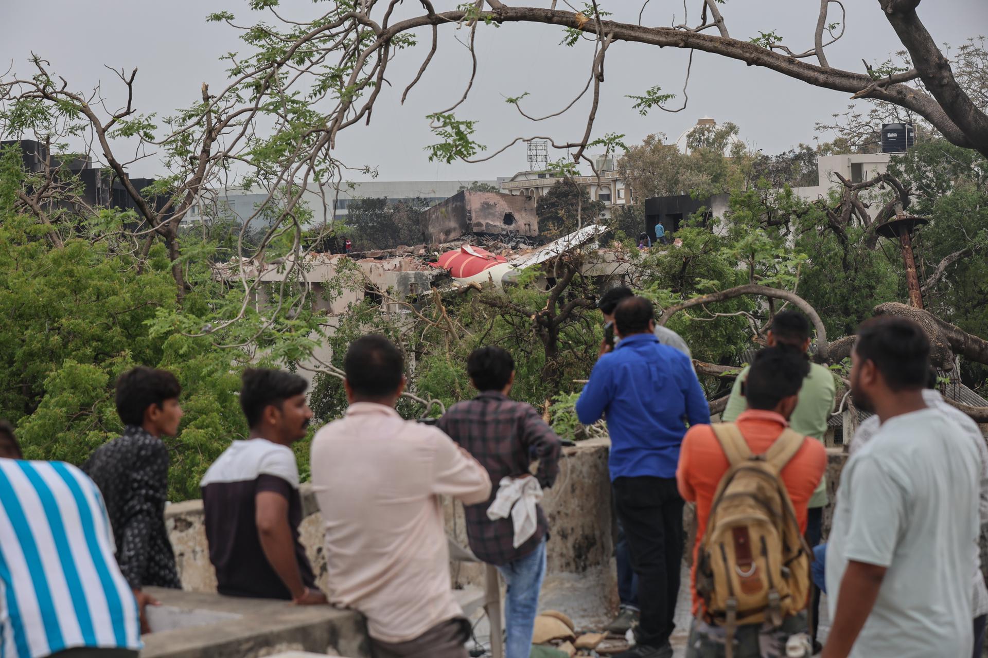 Personas observan los restos de un avión accidentado cerca del Aeropuerto Internacional Sardar Vallabhbhai Patel en Ahmedabad, Gujarat, oeste de la India, el 13 de junio de 2025. EFE/EPA/RAJAT GUPTA