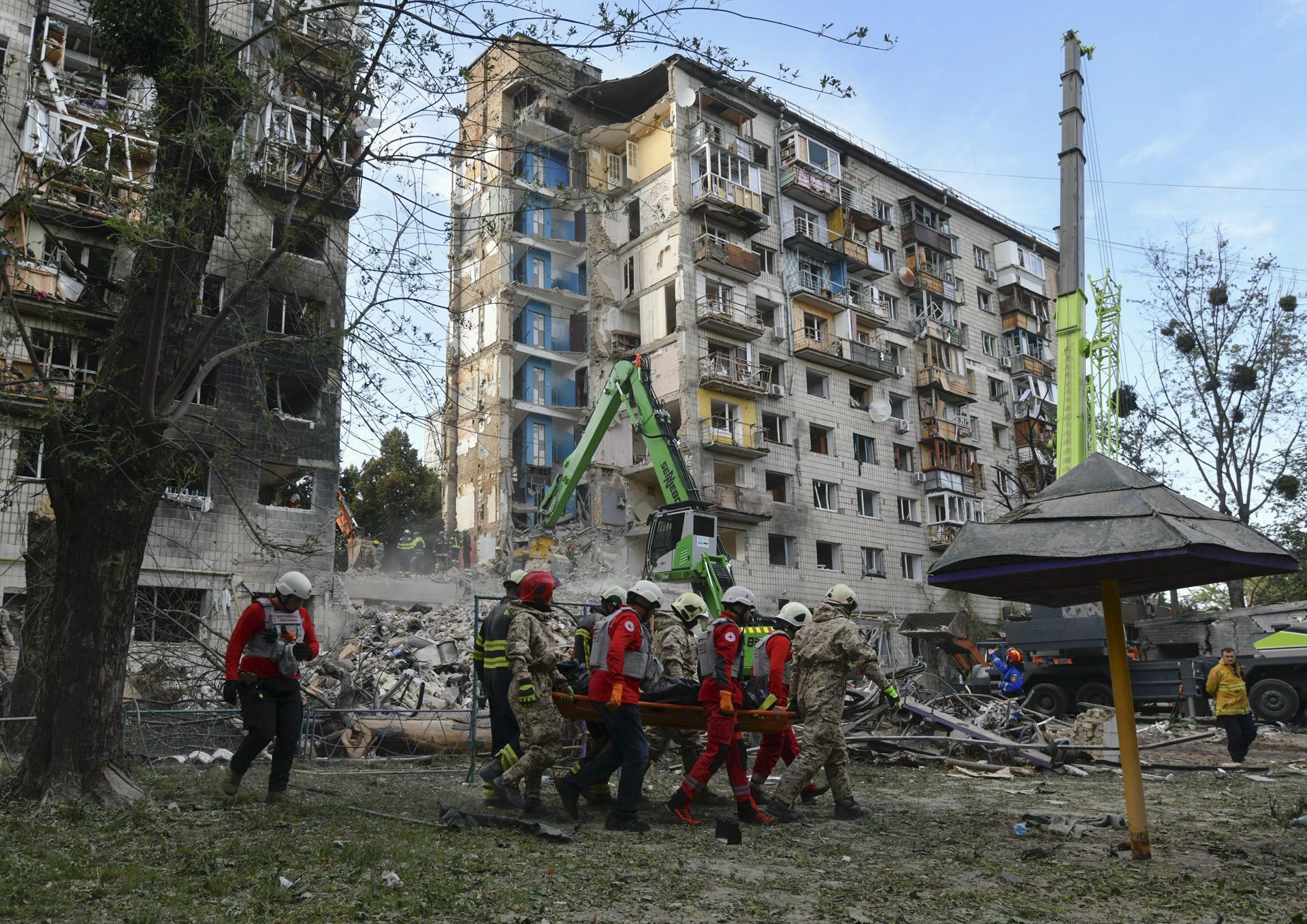El Servicio Estatal de Emergencias detalló que 23 de las víctimas mortales se encontraban en un edificio residencial de nueve plantas en el distrito de Solomianski, que fue alcanzado directamente por un misil.