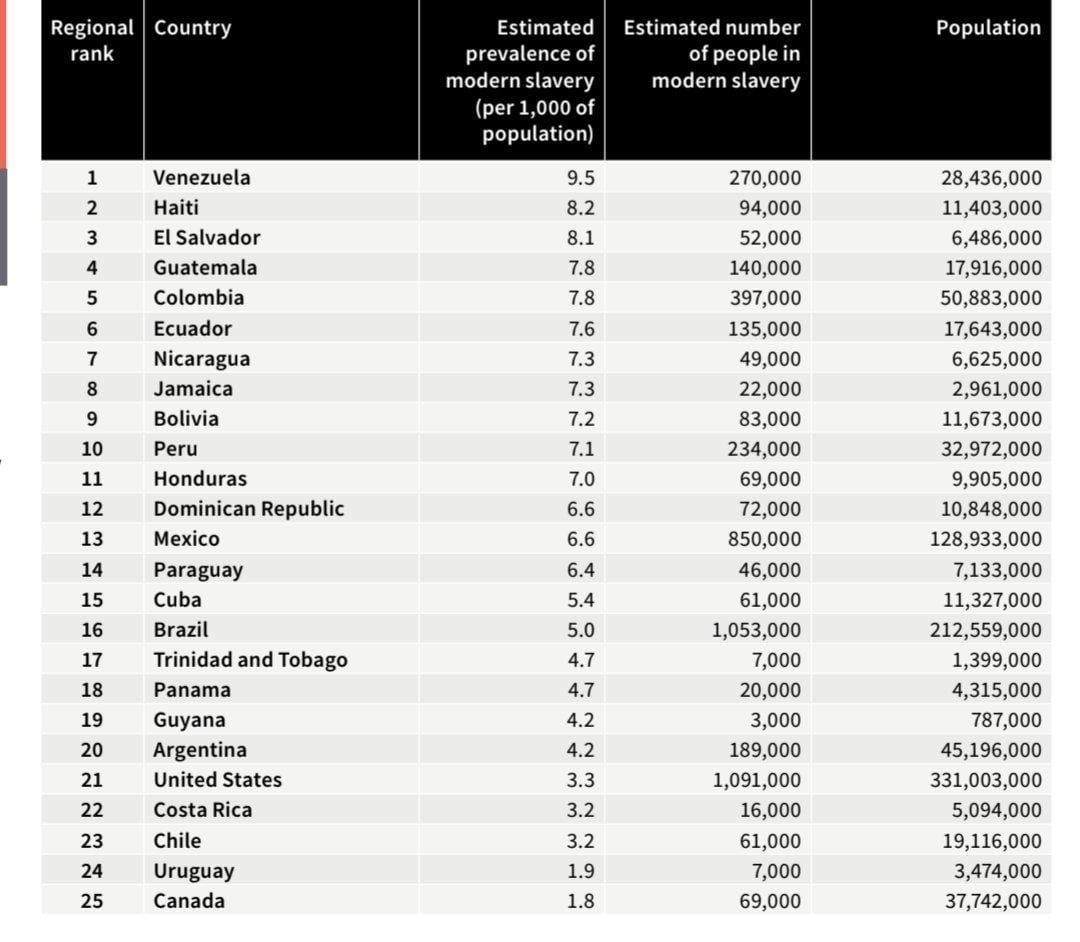 La “prevalencia de la esclavitud moderna en las Américas”, medida como la cantidad estimada de personas afectadas por cada 1,000 habitantes, se sitúa en 5 personas por cada 1,000, en toda la región, el informe estima que hay aproximadamente 5.1 millones de personas esclavizadas.