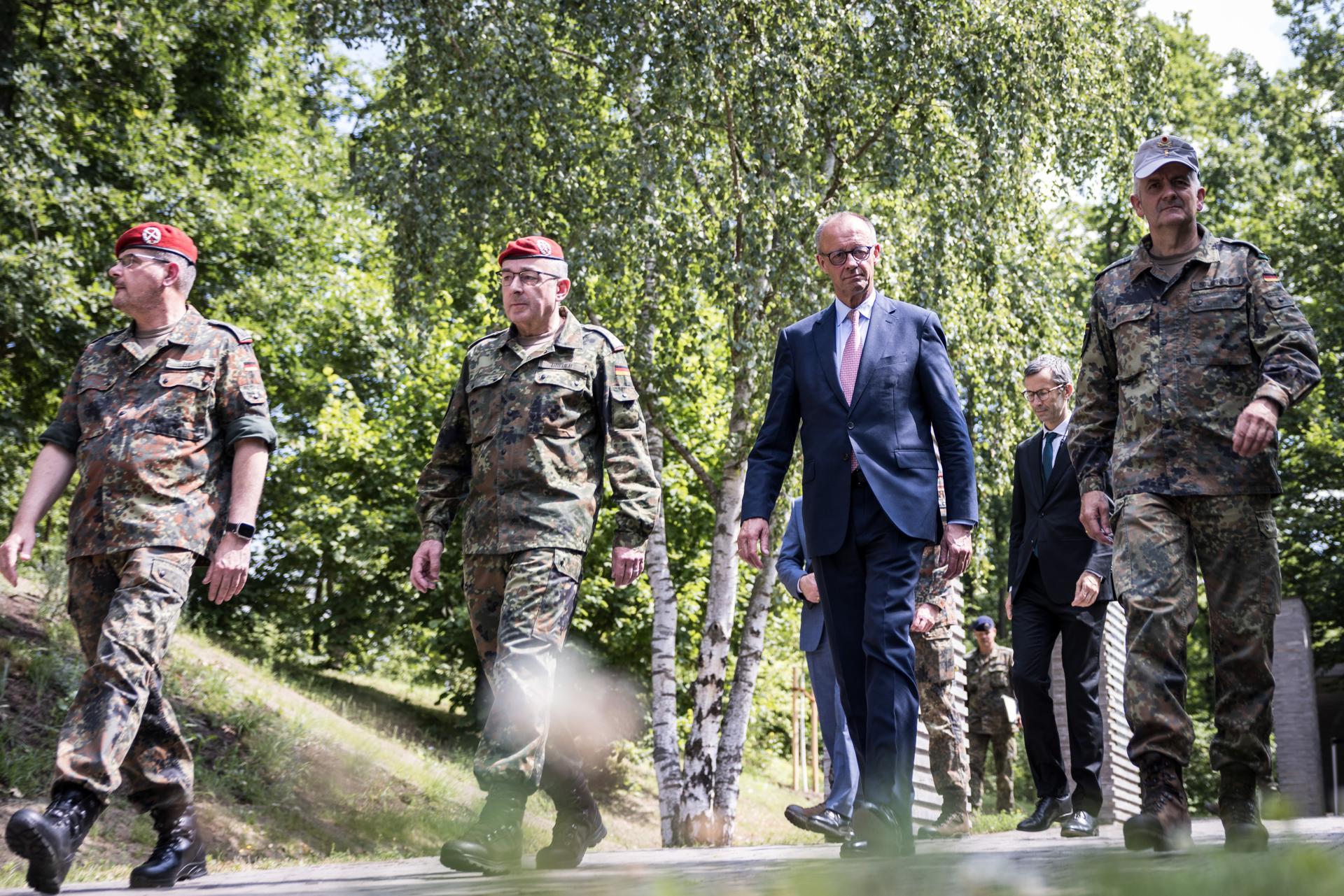 El canciller alemán, Friedrich Merz (centro), visita el Comando Operacional de la Bundeswehr en Henning von Tresckow Kaserne con motivo del "Día de la Bundeswehr", un evento anual en el que las Fuerzas Armadas Alemanas celebran jornadas de puertas abiertas en Schwielowsee, Alemania. EFE/EPA/NADJA WOHLLEBEN / POOL