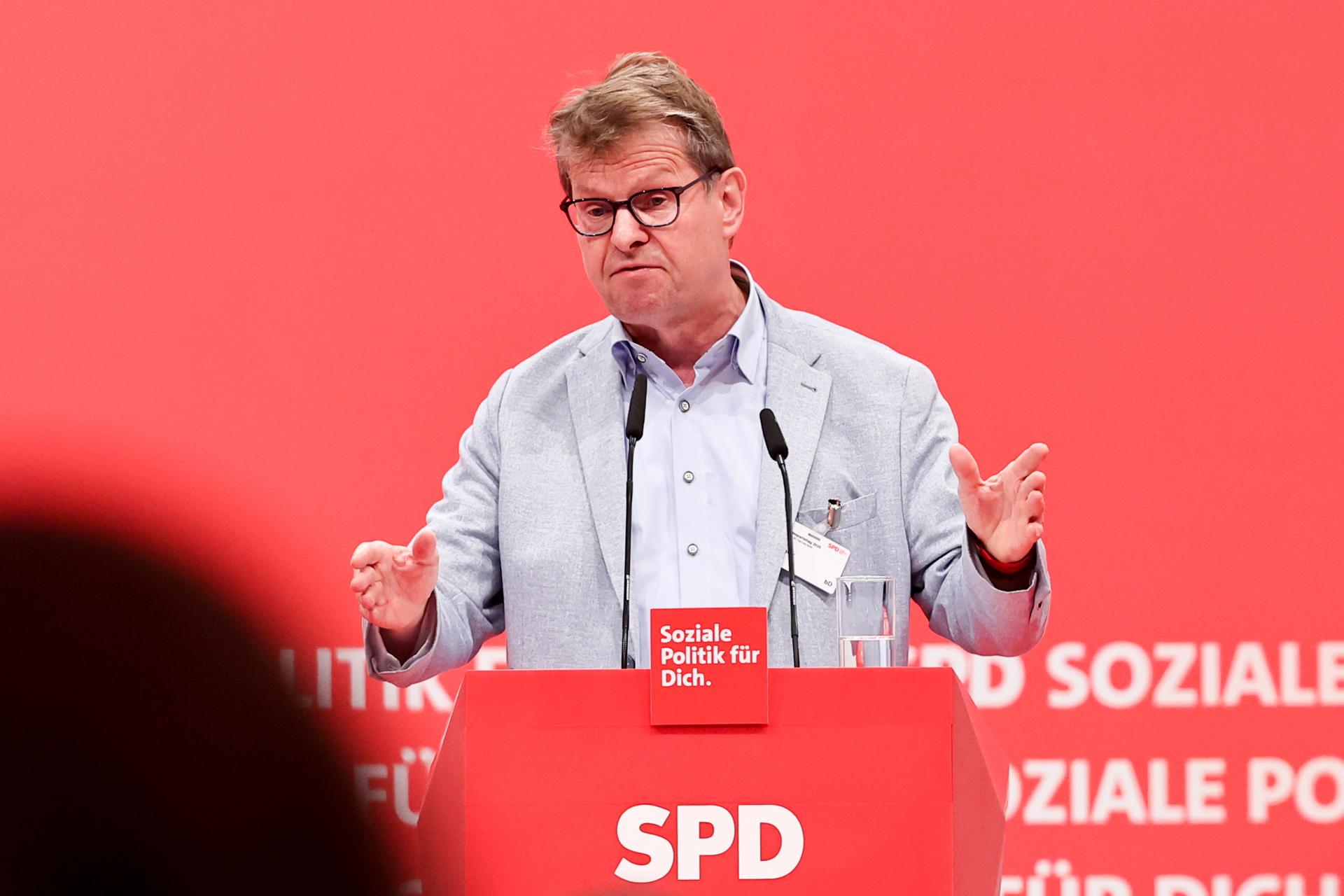 Ralf Stegner, del Partido Socialdemócrata de Alemania (SPD), habla durante el Congreso del SPD en el City Cube de Berlín, Alemania. EFE/EPA/FILIP SINGER