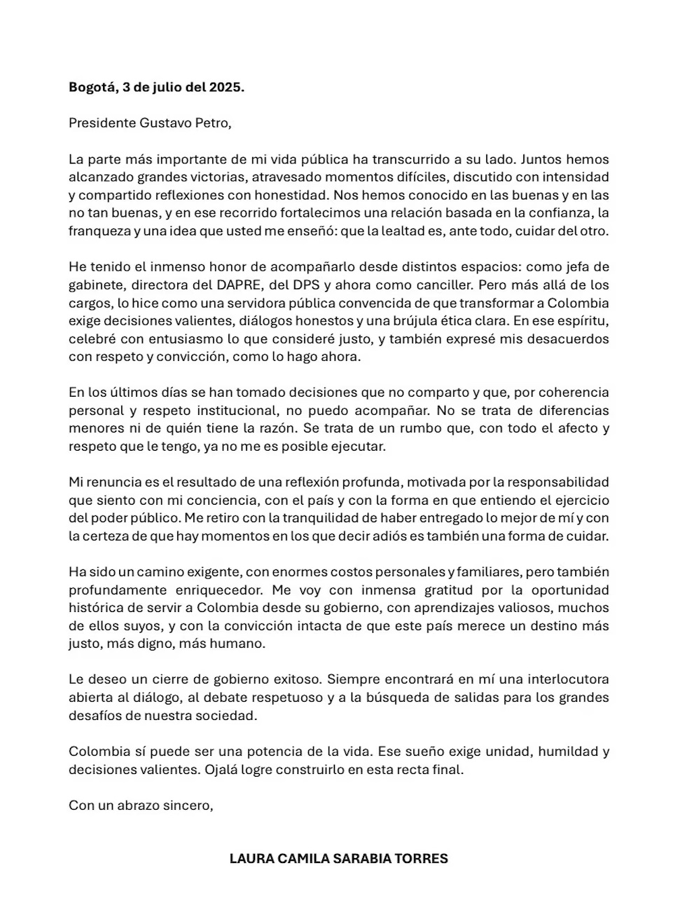“Mi renuncia es el resultado de una reflexión profunda, motivada por la responsabilidad que siento con mi conciencia, con el país y con la forma en que entiendo el ejercicio del poder público”, dijo Sarabia en una carta dirigida a Petro.