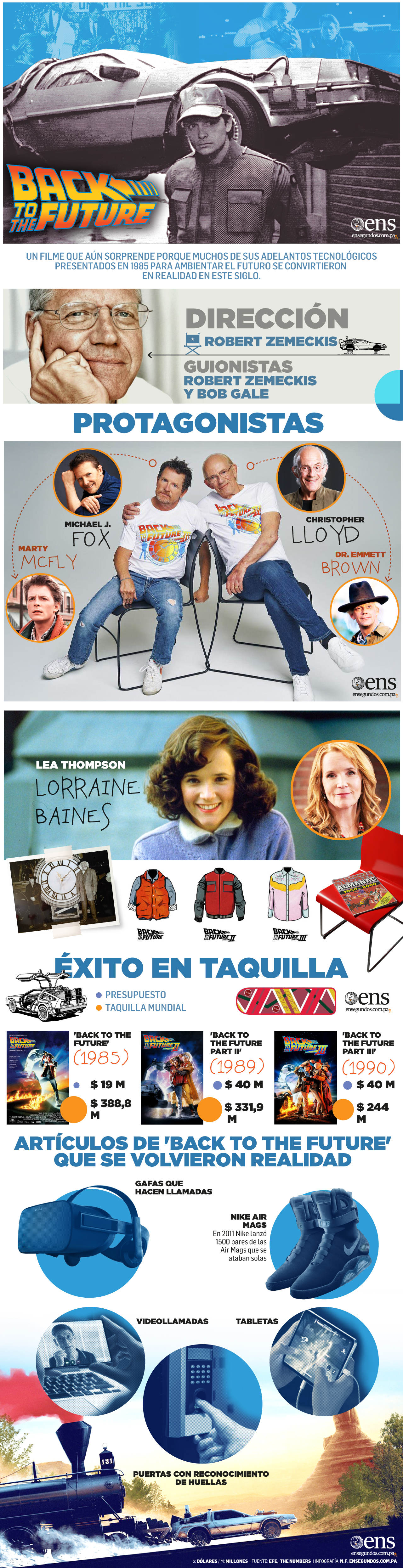 Cintillo, Estilos, Infografía Back to the future, cumple 40 años Infografia: N. Fernández, Ensegundos.com | EFE 4 julio, 2025 Arte Back to the future Cine Cultura espectáculos Infografia Saga Volver al futuro Ilustración: N. Fernández WhatsAppFacebookTwitterGoogle+LinkedInPinterest Back to the future, una de las sagas más populares y exitosas del cine y que marcó la cultura popular hasta la actualidad, tuvo el estreno de su primera película hace 40 años
