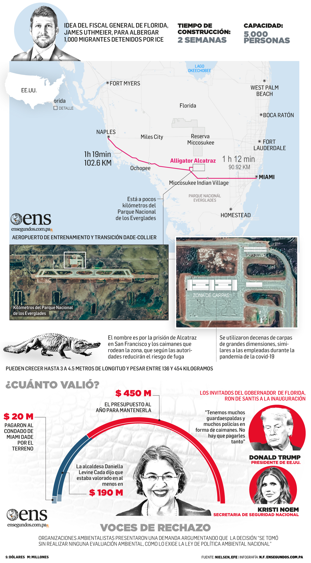 ‘Alligator Alcatraz’ (Alcatraz Caimán), un nuevo centro de detención para inmigrantes en el sur de Florida, esta nueva instalación, con capacidad para 5,000 detenidos, ha sido criticada por políticos y organizaciones ambientalistas que acusan al Gobierno de haberse saltado la ley para acelerar su construcción cerca de uno de los humedales más grandes del país, infestado de caimanes.