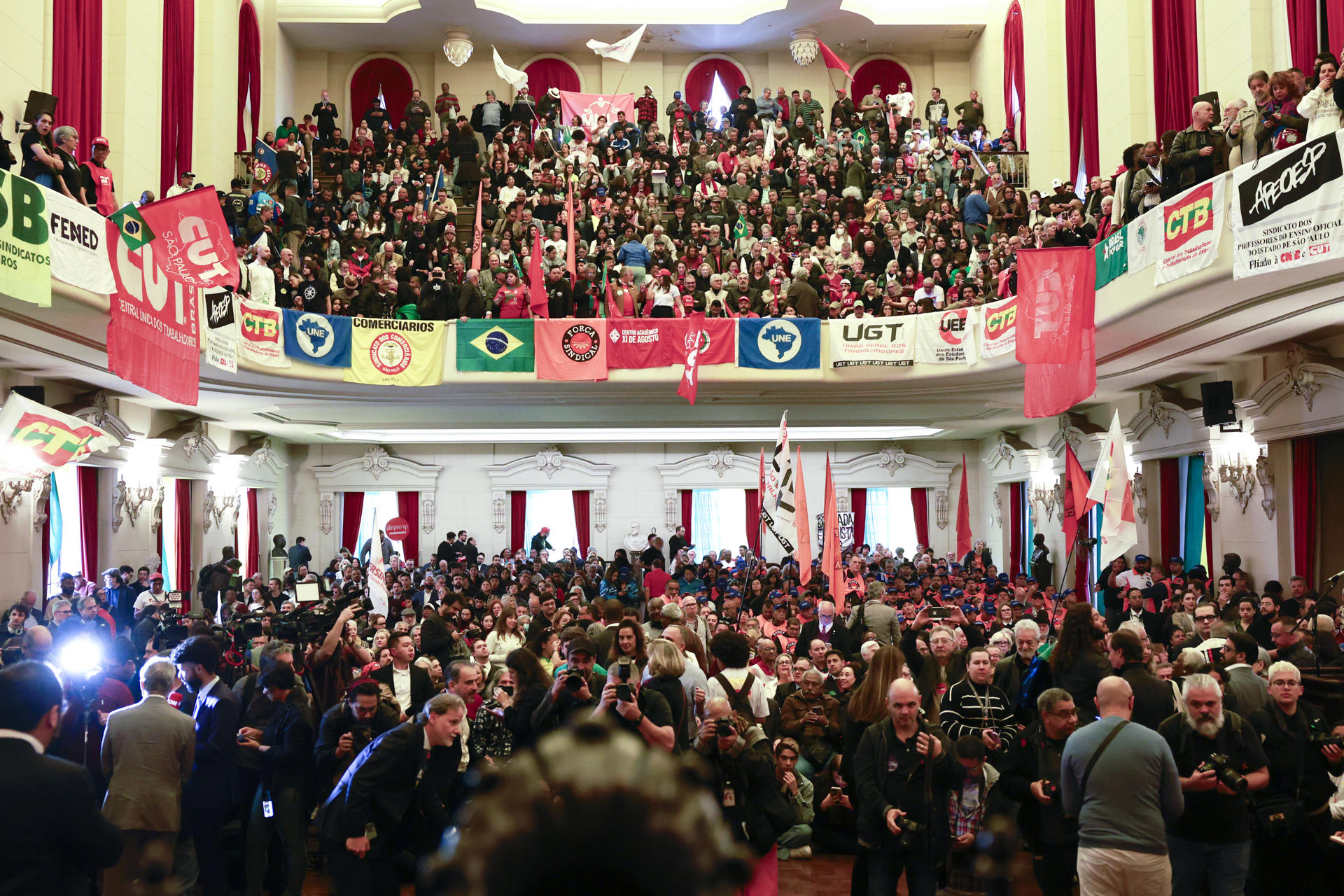 Personas asisten al lanzamiento de un manifiesto en defensa de la soberanía nacional este viernes, en São Paulo (Brasil). EFE/ Sebastiao Moreira
