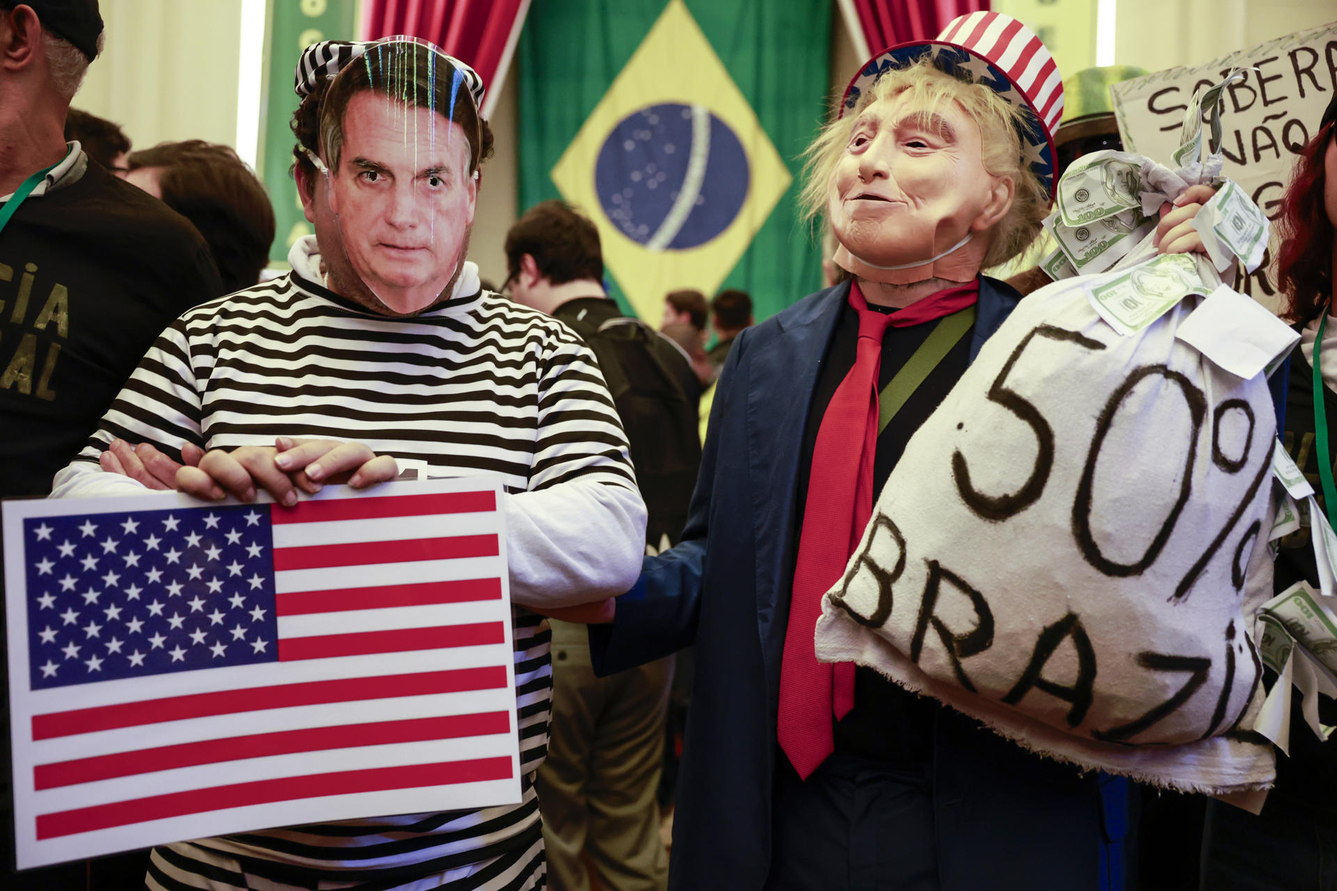 Personas con máscaras del presidente de Estados Unidos, Donald Trump, y del expresidente de Brasil Jair Bolsonaro asisten al lanzamiento de un manifiesto en defensa de la soberanía nacional este viernes, en São Paulo (Brasil). EFE/ Sebastiao Moreira