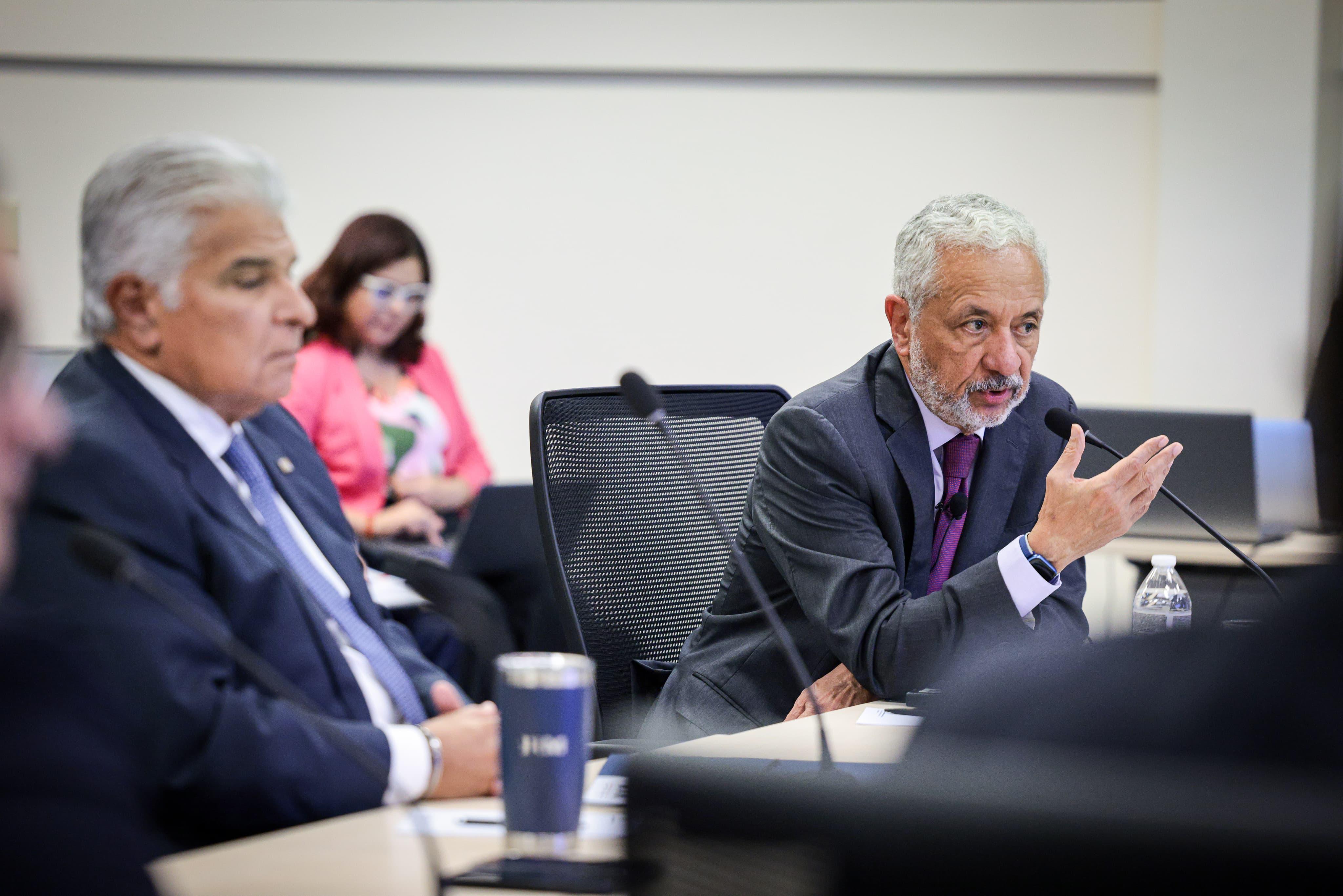 El mandatario estuvo acompañado por varios ministros y asesores clave, mientras que la delegación del Canal fue liderada por el administrador Ricaurte Vásquez Morales y la subadministradora Ilya Espino de Marotta, junto a los miembros de la Junta Directiva.
