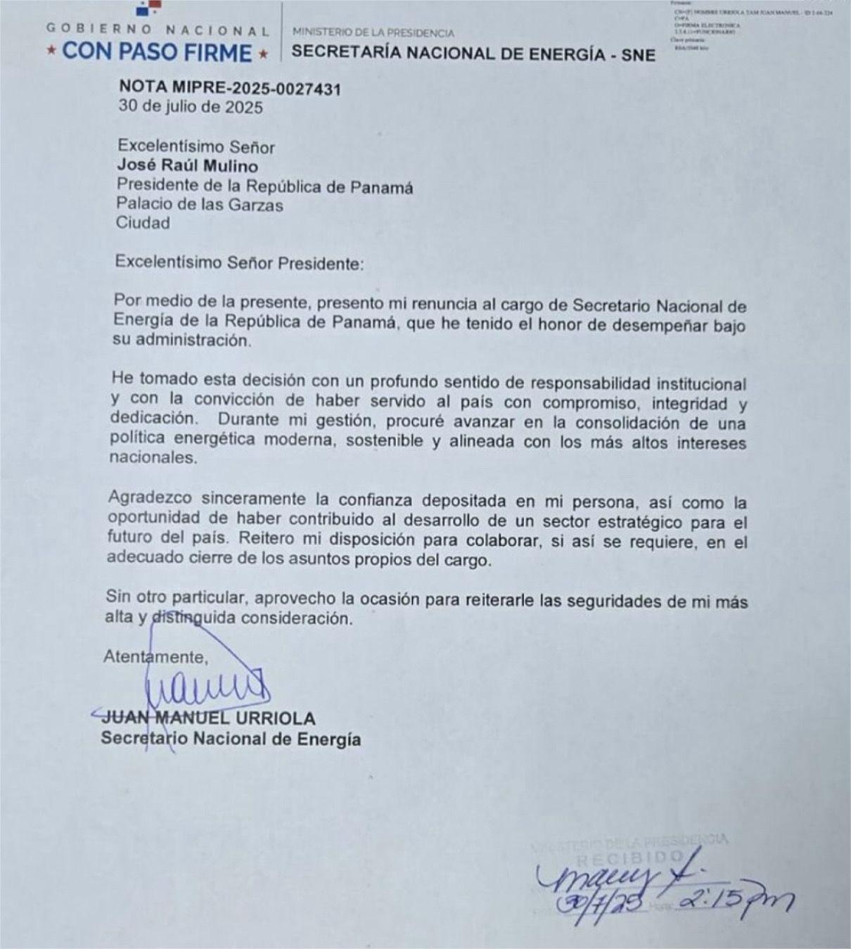 La tarde de este miércoles se confirmó la renuncia de Juan Manuel Urriola como Secretario Nacional de Energía, según informaron voceros de la institución, aunque no se ofrecieron detalles sobre las razones de su salida, Urriola comunicó públicamente su decisión a través de su cuenta en la red social X, donde también compartió su carta de renuncia dirigida al presidente José Raúl Mulino, informó TVN Noticias.