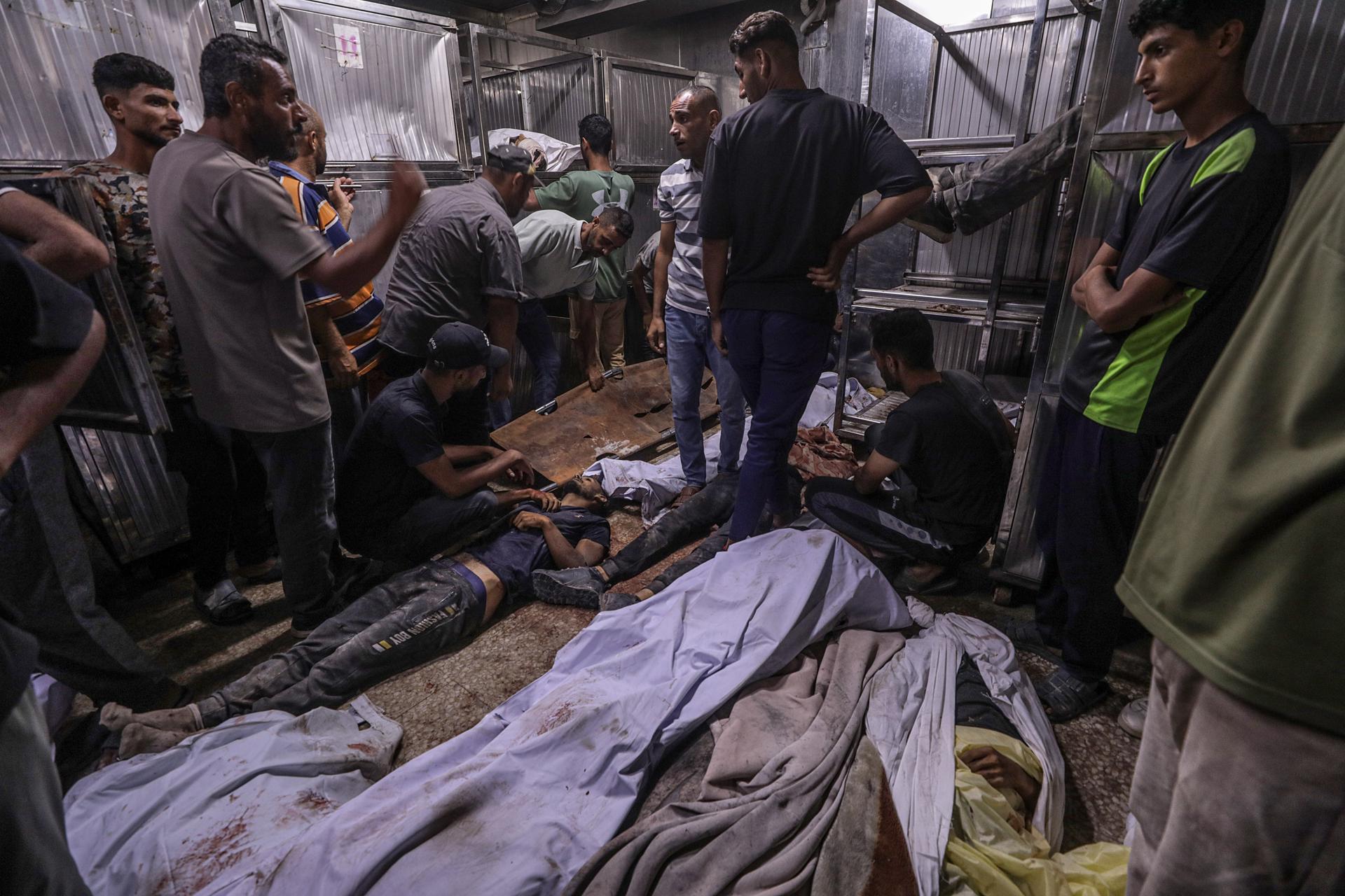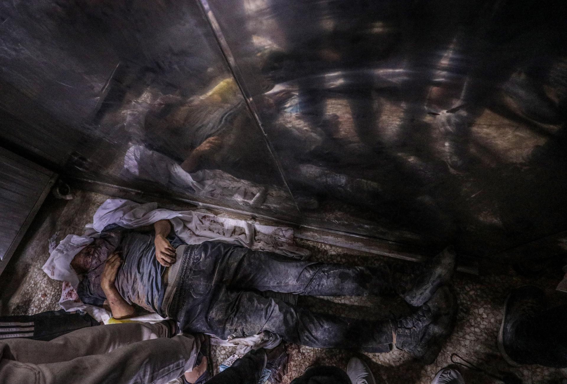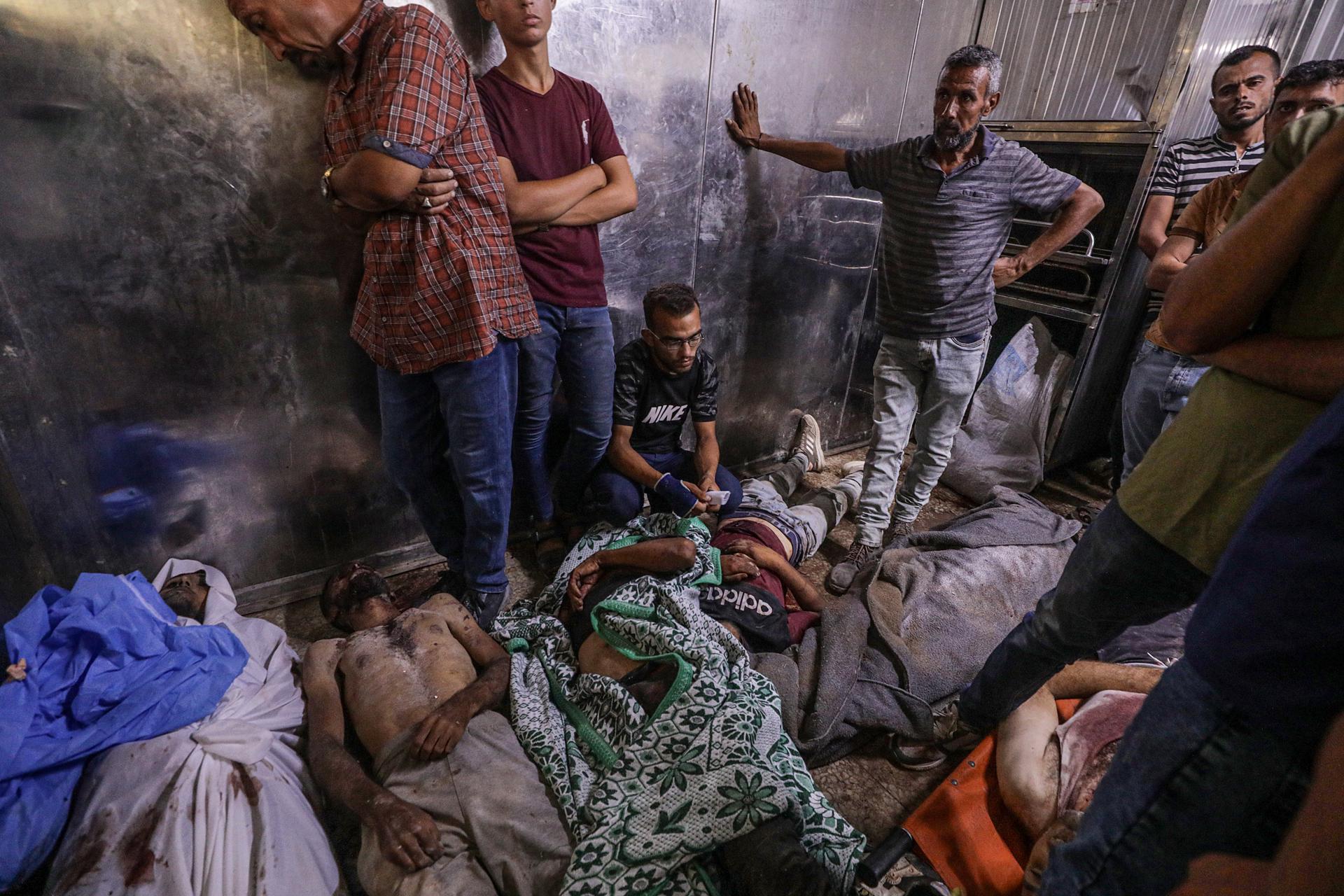 Este jueves, en la morgue del Shifa ya no cabe nadie más. Los vivos están de pie, ocupando los pequeños huecos que quedan entre los más de diez cuerpos que hay tirados en el suelo, algunos apilados unos encima de otros.