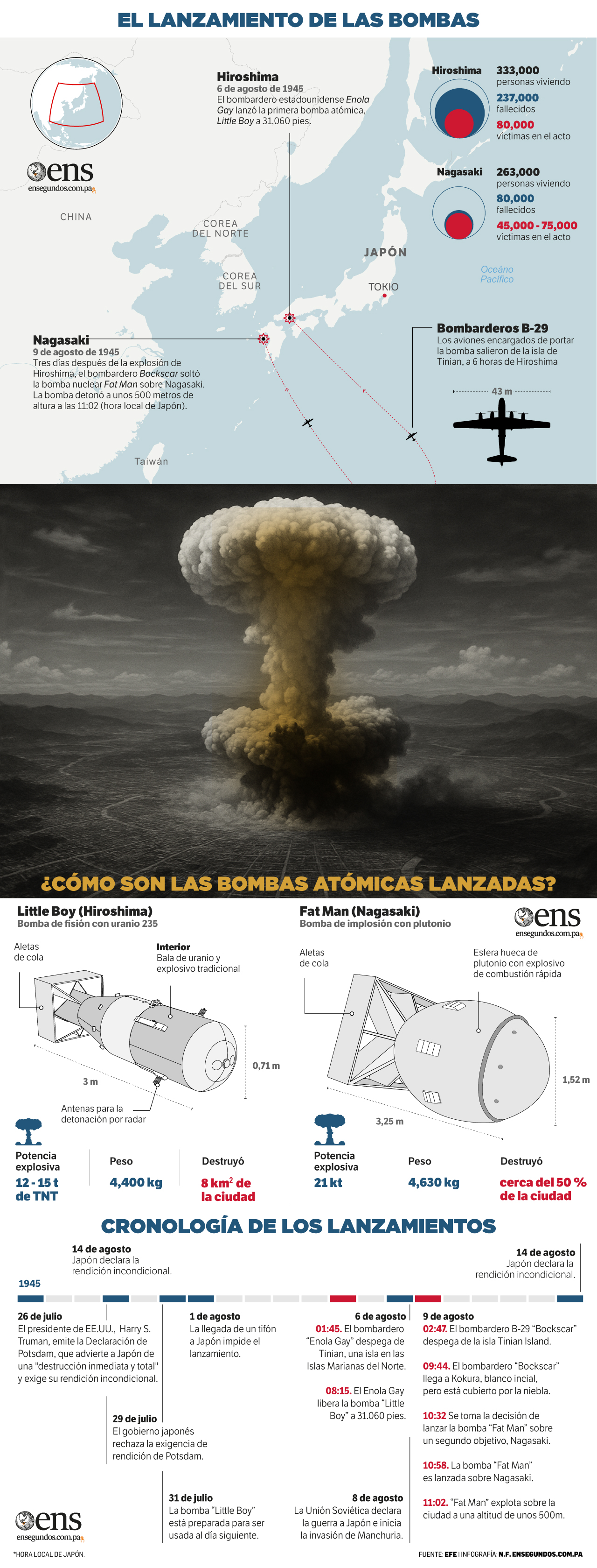 Cintillo, Infografía 80 aniversario del bombardeo atómico de Hiroshima y Nagasaki Infografía N. Fernández, Ensegundos.com | EFE 6 agosto, 2025 Arte conflictos Cultura Disturbios Guerra Hiroshima Historia Infografia Nagasaki Ilustración: N. Fernández Ensegundos.com.pa WhatsAppFacebookTwitterGoogle+LinkedInPinterest La ciudad japonesa de Hiroshima se prepara este martes para conmemorar el miércoles el 80 aniversario del primer bombardeo atómico de la historia, con una ceremonia que contará con la representación diplomática de 120 países, una cifra récord