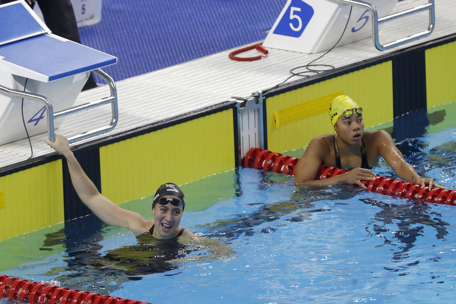 Las nadadoras Emily Santos (i) de Panamá y Sabrina Lyn de Jamaica, reaccionan al finalizar la competencia en la categoría 100 metros pecho femenino. EFE/Juan Pablo Pino