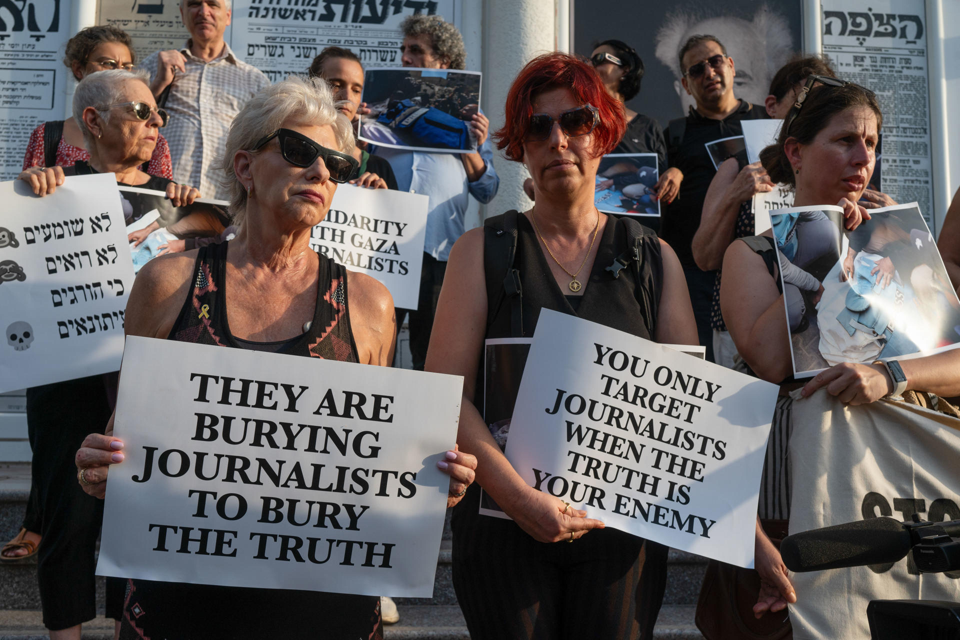 “Dejad de asesinar a periodistas en Gaza”, se leía en una pancarta escrita en hebreo, inglés y árabe, sostenida por los manifestantes que guardaron media hora de silencio.