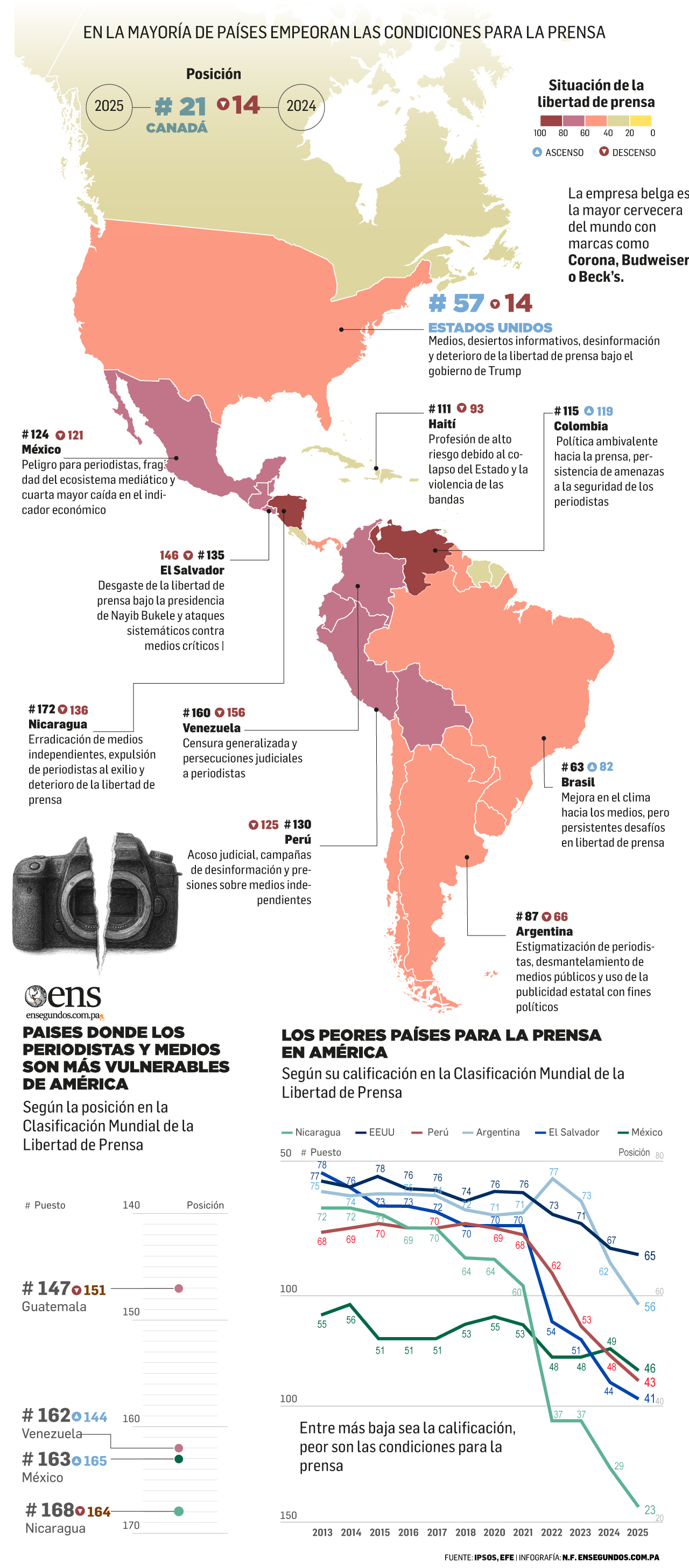 El periodismo en América afronta una crisis que genera consecuencias cada vez más graves para su ejercicio, con 22 de los 28 países de la región registrando descensos en su indicador económico, según la Clasificación Mundial de la Libertad de Prensa 2025 publicada por la organización francesa Reporteros sin Fronteras (RSF)