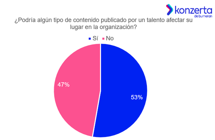 El estudio, que contó con la participación de 2,743 trabajadores y especialistas en recursos humanos de cinco países latinoamericanos, también revela que un 25% de los especialistas considera que, si una publicación afecta la imagen de la organización, se podrían tomar medidas que varían desde una conversación informal hasta la rescisión del contrato, dependiendo de la gravedad.