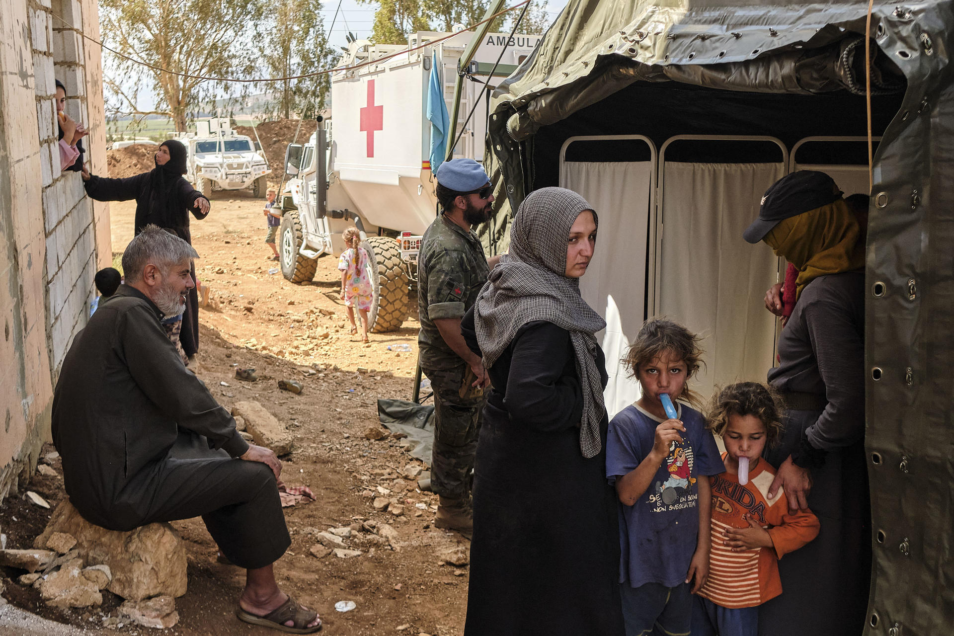 Entre las consultas y la entrega de medicamentos, los niños juegan al clásico “Un, dos, tres, toca la pared” bajo la mirada atenta de una soldado. La escena contrasta con el trajín constante de familias que entran y salen del campamento médico, donde una doctora española y un médico serbio, junto a sus respectivos equipos, ofrecen atención gratuita en jornadas que alcanzan hasta medio centenar de pacientes.