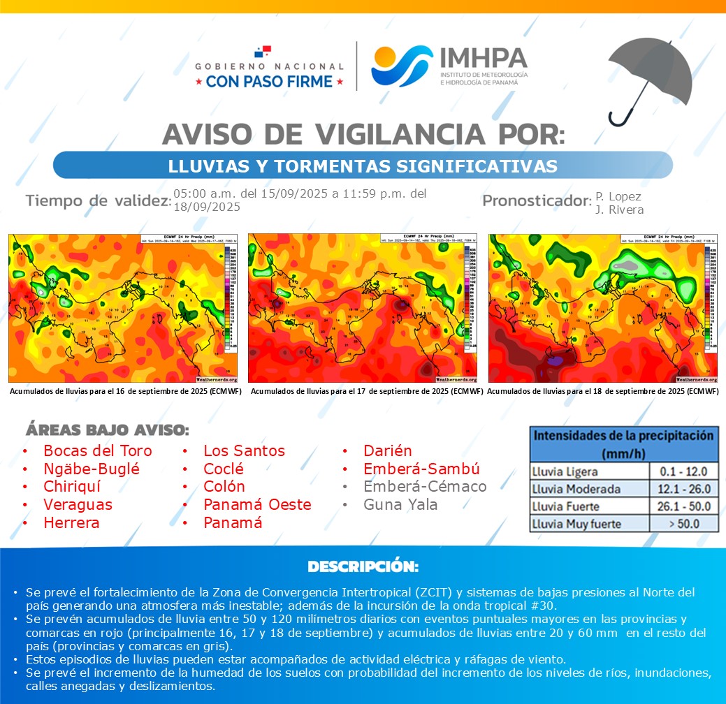 Se prevén acumulados de lluvia entre 50 y 120 milímetros, con eventos puntuales mayores en las provincias de Bocas del Toro, Chiriquí, Veraguas, Herrera, Los Santos, Coclé, Colón, Panamá Oeste, Panamá, Darién y las comarcas Ngäbe- Buglé y Emberá – Sambú.
