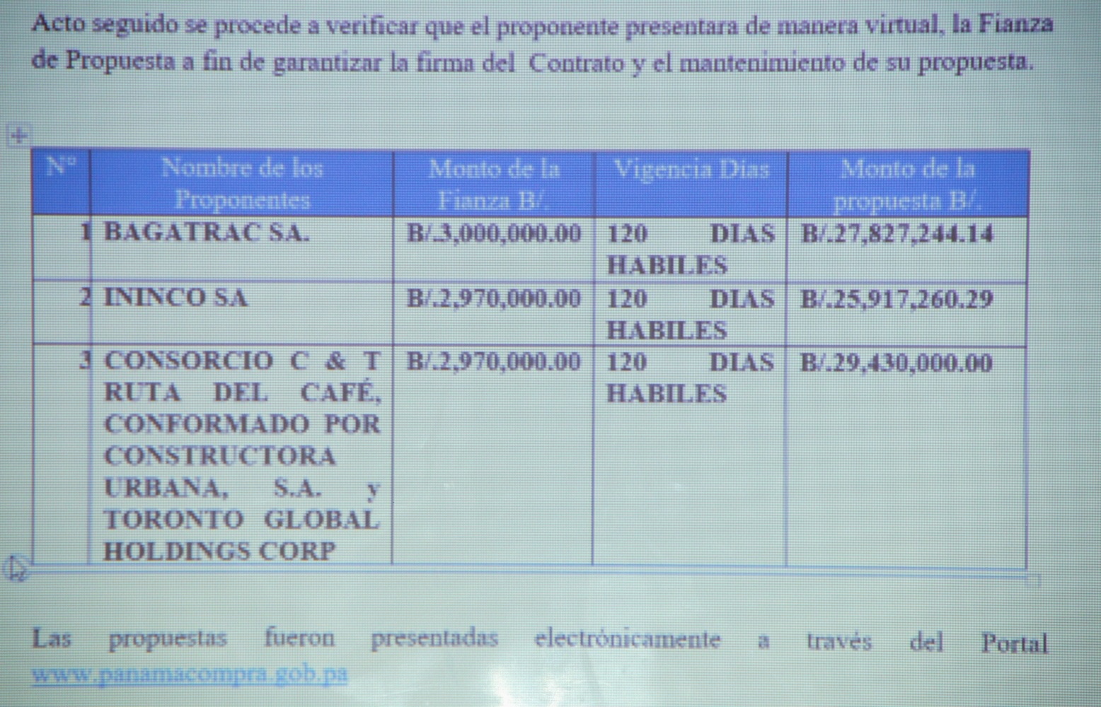 Las propuestas fueron recibidas a través del portal Panamá Compra. Las ofertas presentadas fueron: Bagatrac S.A. ofertó $27.8 millones; Ininco S.A. propuso $25.9 millones y el Consorcio CT Ruta del Café (Constructora Urbana S.A. y Toronto Global Holding Corp.) con $29.4 millones.