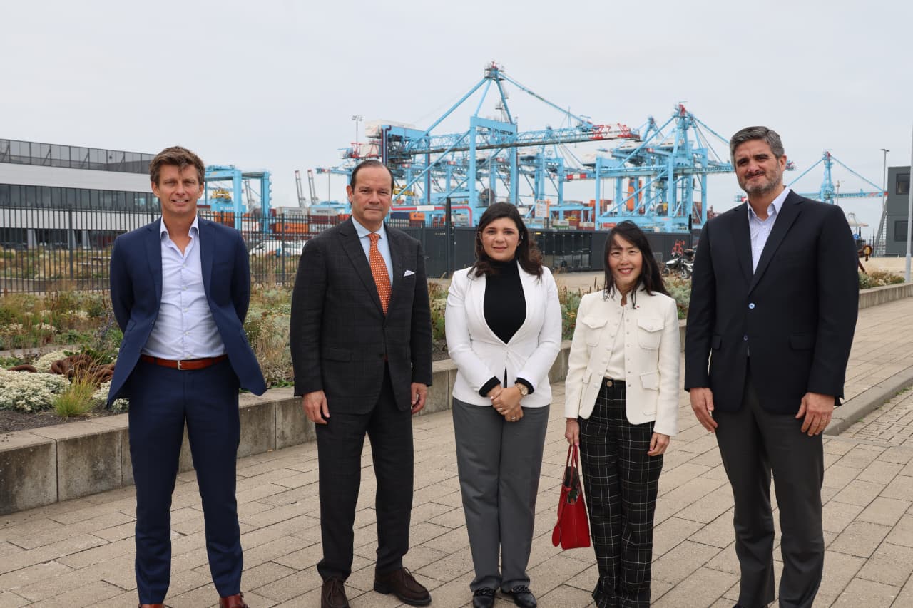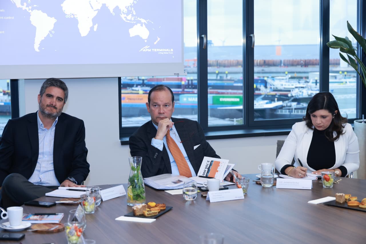 Durante el recorrido fue recibido por Otto Geukers, director financiero de APM Terminal; Ernesto Montagne, jefe legal de APM Terminal para América Latina; y Herman Wirtz, jefe de integración empresarial de la misma empresa, filial del Grupo Maersk. Administra la avanzada APM Terminals Maasvlakte II, un puerto automatizado y preparado para el futuro de los grandes buques portacontenedores.