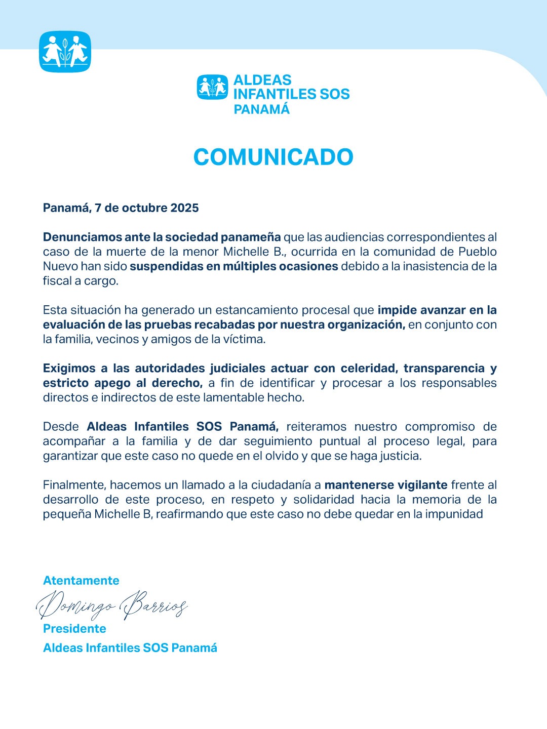 Las Aldeas Infantiles SOS Panamá, a través de su presidente Domingo Barrios, denunciaron la paralización del proceso judicial relacionado con la muerte de la menor Michelle B., ocurrida en la comunidad de Pueblo Nuevo, debido a la reiterada inasistencia de la fiscal a cargo del caso.