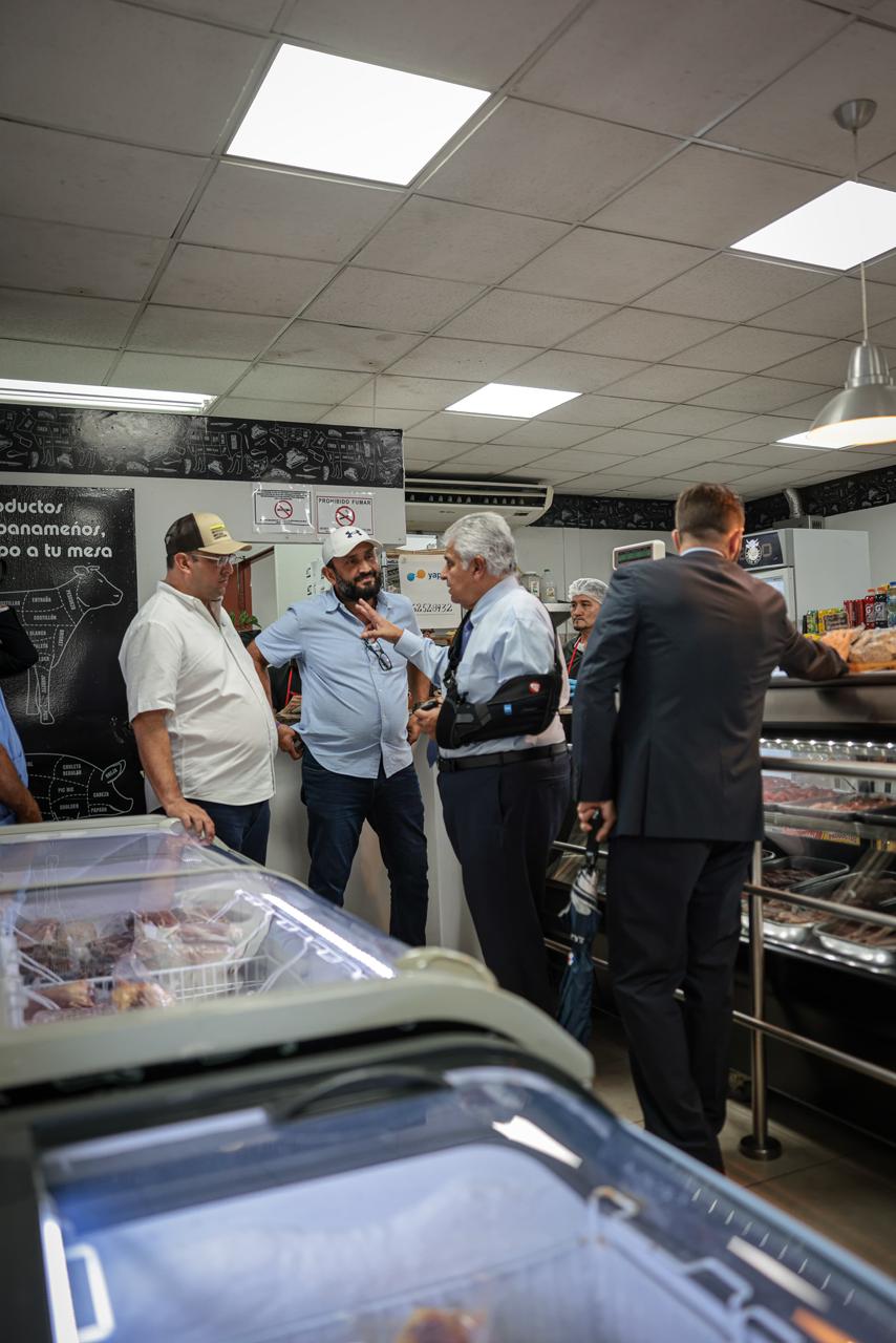 Mulino recorrió el área de cajas, de almacenaje de producto y el cuarto frío, y constató la eficiencia con que opera la Tienda del Pueblo. Igualmente, conversó con trabajadores del local, verificó precios y saludó a compradores que aprovechaban las ofertas.