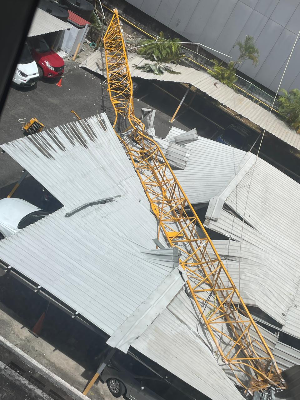Según reportes preliminares, no se registraron personas heridas, pero sí importantes daños materiales. El área se mantiene acordonada mientras las unidades de emergencia realizan maniobras para retirar la grúa, parte de la cual quedó guindando desde lo alto del edificio.