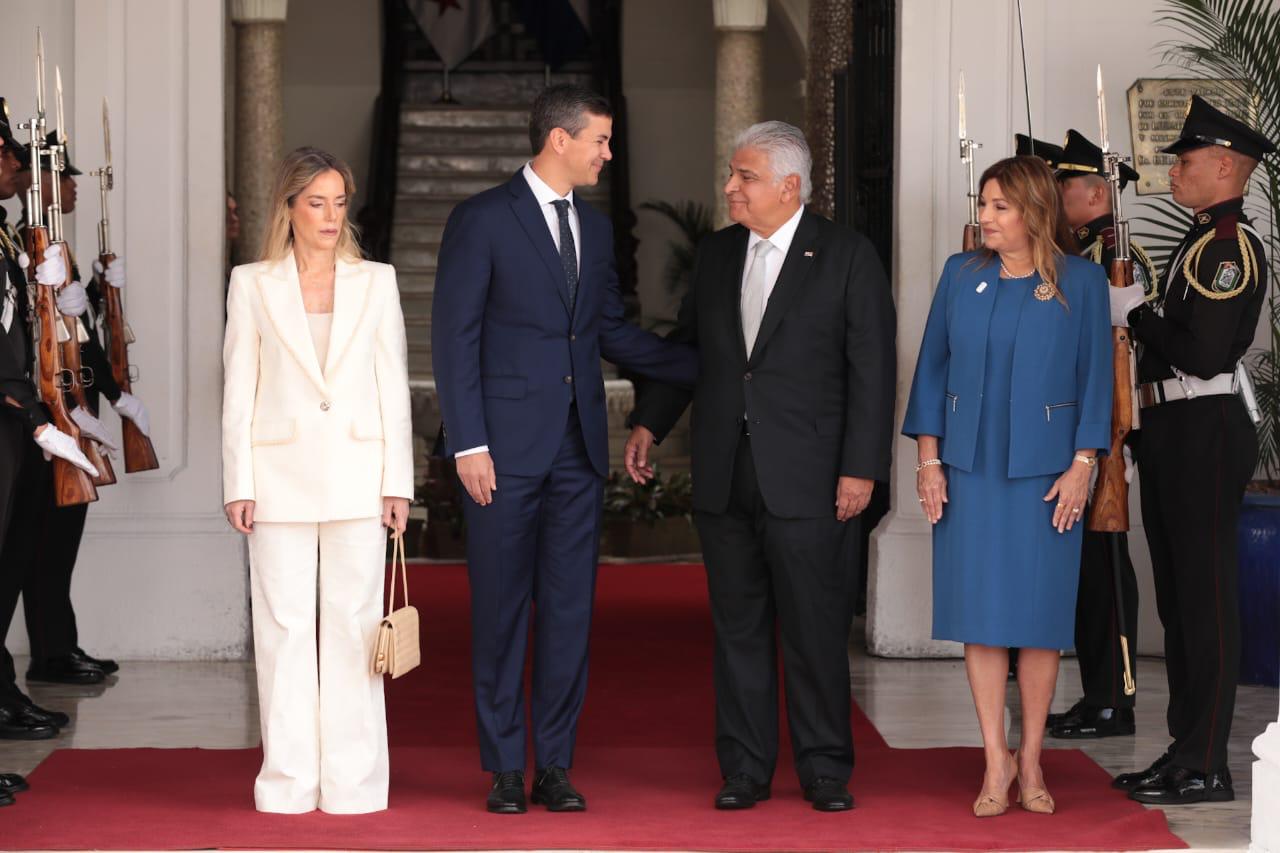 Peña Palacios llegó junto a su esposa Leticia Ocampos Villate y ambos fueron recibidos en las escalinatas de la Presidencia por Mulino y su esposa, la primera dama, Maricel Cohen de Mulino.