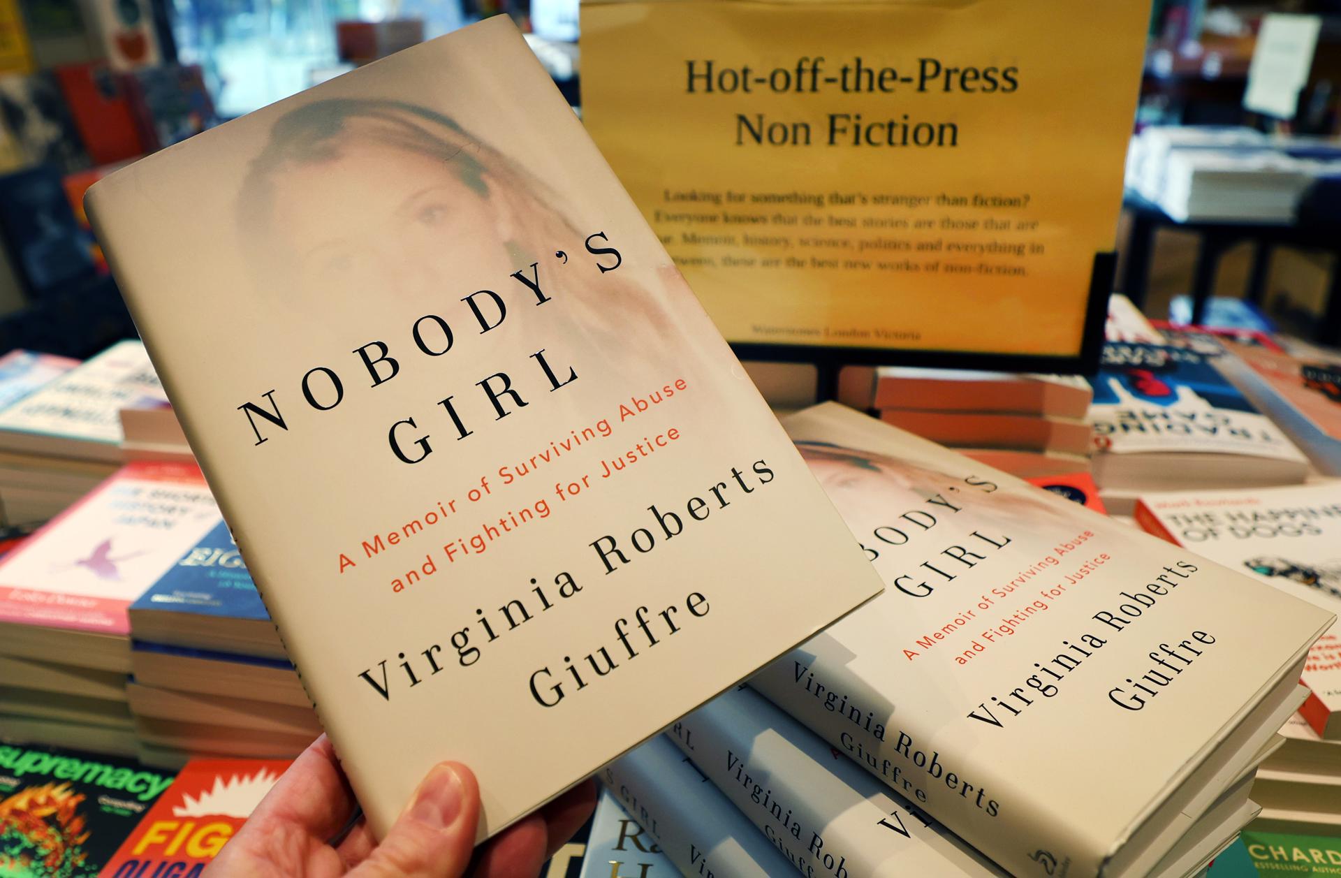 El libro póstumo de Virginia Giuffre, titulado 'Nobody's Girl' (R), se exhibe en una librería tras su publicación en Londres, Reino Unido, 21 de octubre de 2025. Giuffre, quien se quitó la vida hace casi seis meses, había acusado durante años al príncipe Andrew y a Jeffrey Epstein de abusar de ella. (Reino Unido, Londres) EFE/EPA/ANDY RAIN