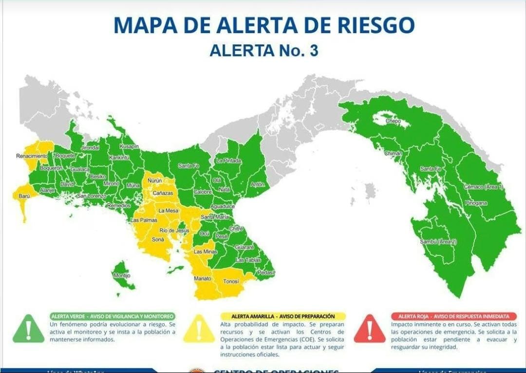 El Sistema Nacional de Protección Civil (SINAPROC) elevó la alerta de verde a amarilla, para el Sur del distrito de Tonosí, en Veraguas y el Sur de Barú en Chiriquí, ante las constantes lluvias y desbordamientos de ríos, como efectos indirectos del huracán Melissa.