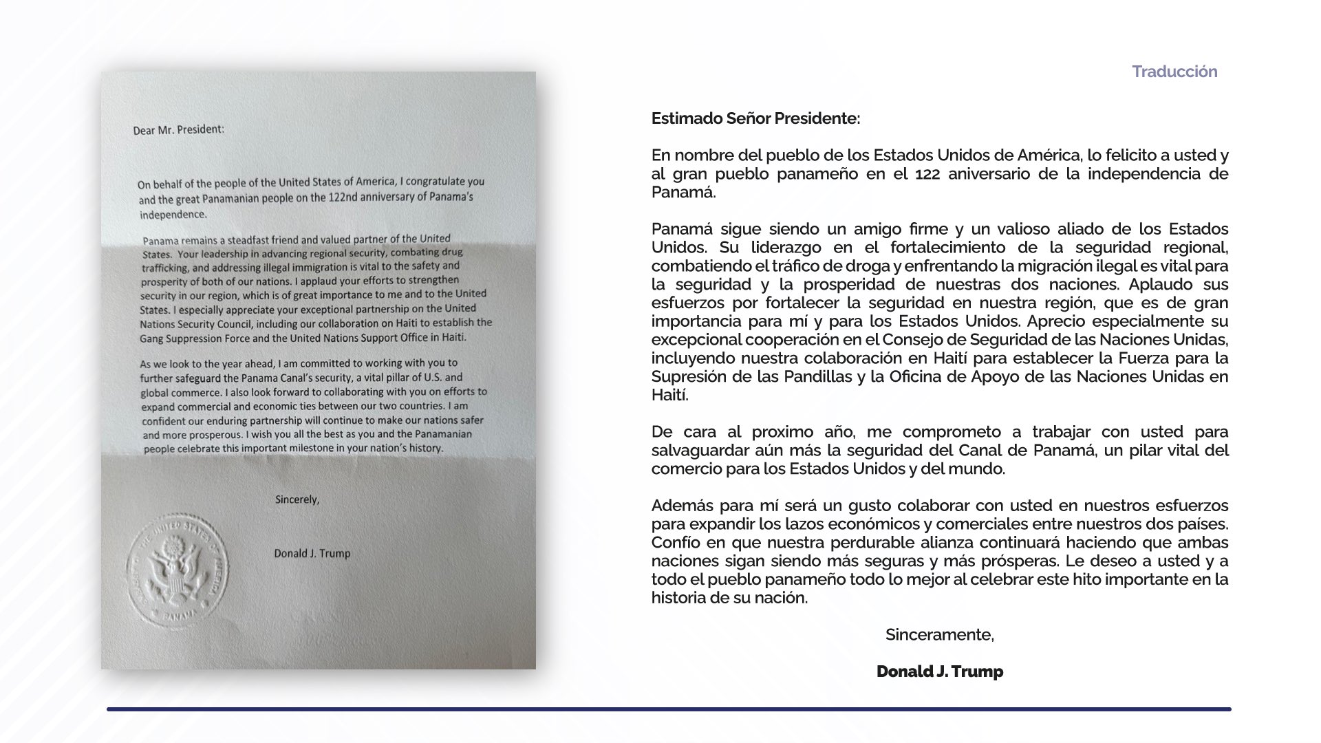 A través de una misiva dirigida al presidente José Raúl Mulino, Trump se comprometió a trabajar con el mandatario panameño “para salvaguardar aún más la seguridad del Canal, un pilar vital del comercio para los Estados Unidos y del mundo”.