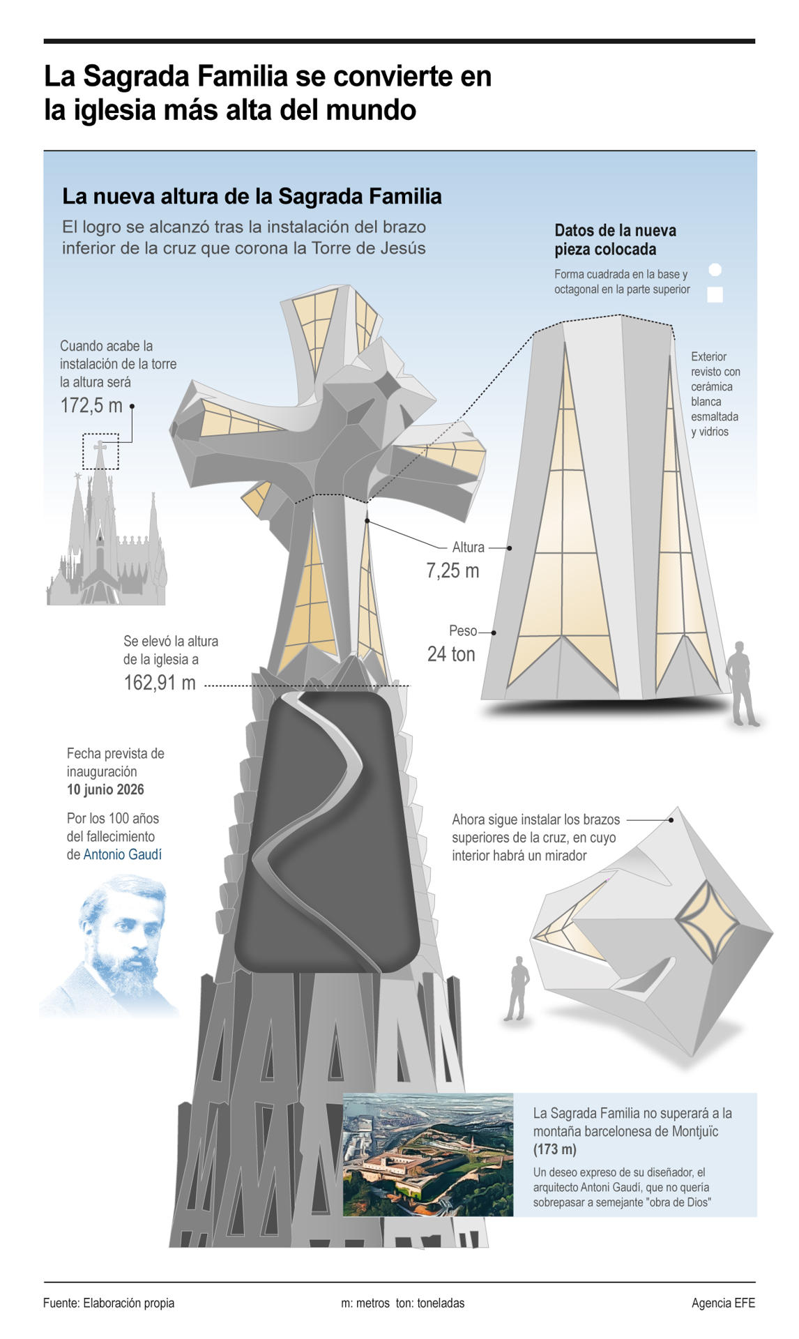 La basílica de la Sagrada Familia, la icónica obra inacabada de Antoni Gaudí y símbolo indiscutible de Barcelona, ha alcanzado un nuevo hito histórico, se ha convertido en el templo católico más alto del mundo, superando los 161.5 metros de la catedral luterana de Ulm, en Alemania, informó la agencia EFE.