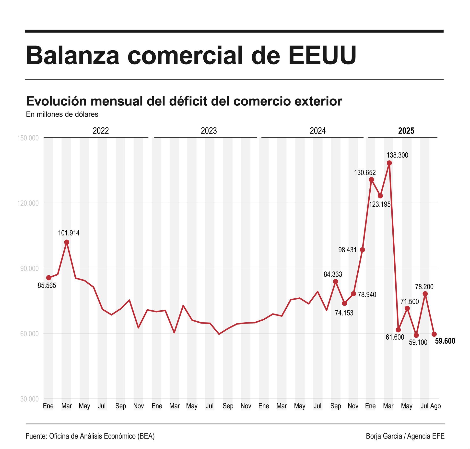 El déficit comercial de Estados Unidos cayó en agosto un 23,8 % con respecto al mes anterior, hasta situarse en los $59,600 millones, de acuerdo con los registros publicados este miércoles por el Buró de Análisis Económico (BEA), que no se presentaron el pasado 7 de octubre debido al cierre del Gobierno federal, informó la agencia EFE.