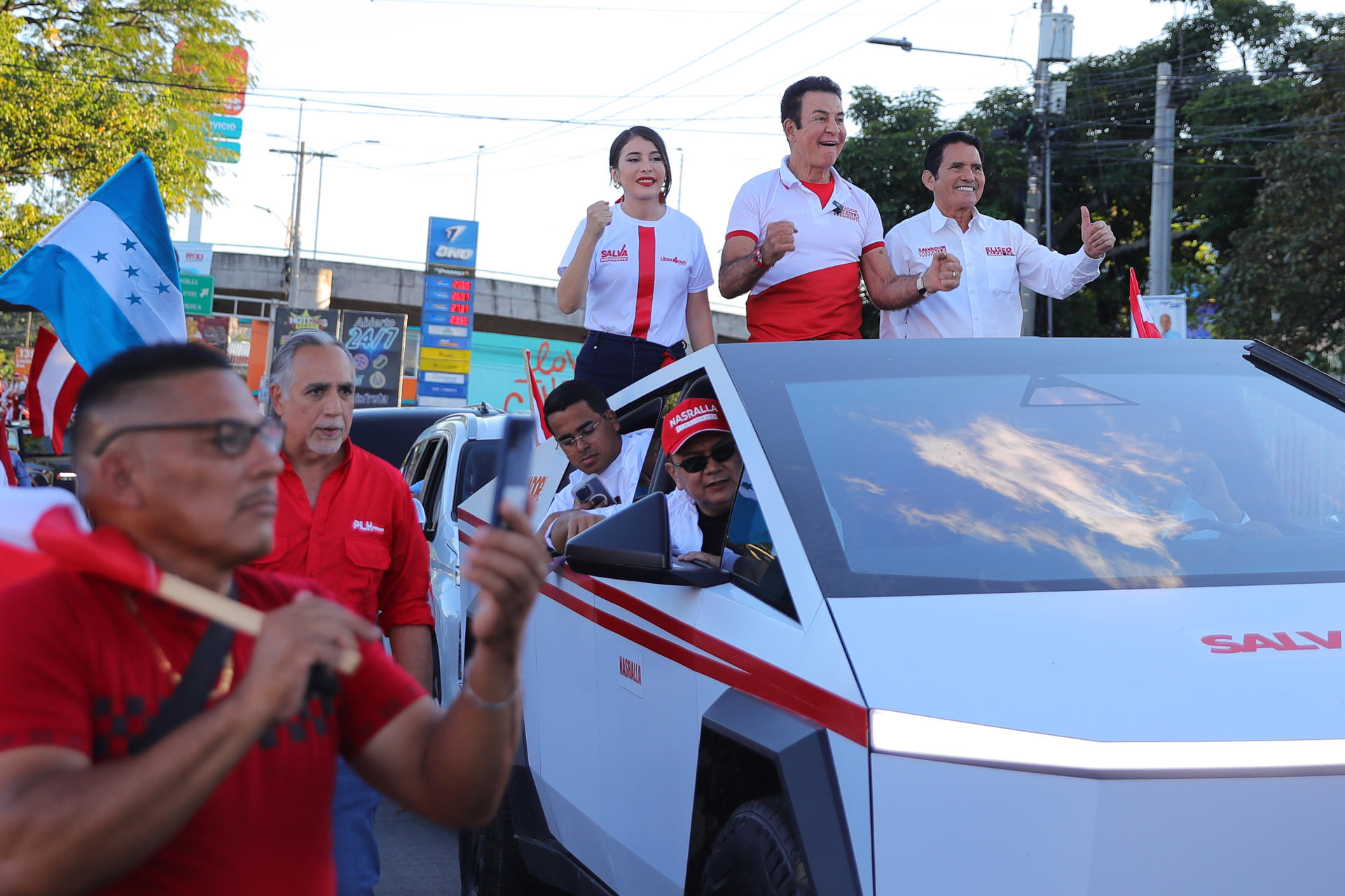 El candidato presidencial por el partido Liberal, Salvador Nasralla (2-d) participa en una caravana de cierre de campaña, junto a su esposa Iroska Elvir (c) y el candidato a alcaldía de Tegucigalpa, Eliseo Castro (d) este sábado, en Tegucigalpa (Honduras). EFE/ Gustavo Amador