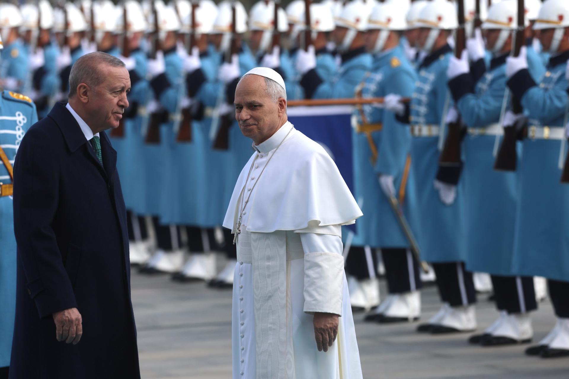 León XIV fue recibido en el palacio presidencial con honores de jefe de Estado y una salva de 21 cañonazos, acto tras el cual se reunió primero en privado con Erdogan y luego participó en una ceremonia pública, en la que el pontífice se sentó entre el público mientras hablaba el presidente turco para luego subir al estrado y ofrecer su propio discurso, con el mandatario turco escuchando en primera fila.