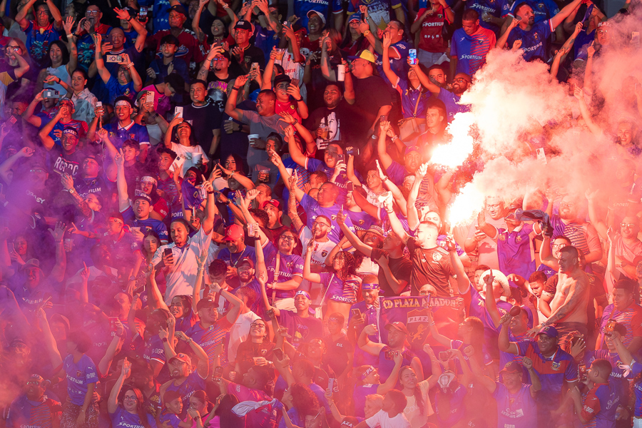 Hinchas de Plaza Amador celebra un gol  en la final de la Liga Panameña entre Plaza Amador y Alianza FC en el estadio Rommel Fernández Gutiérrez, en Ciudad de Panamá (Panamá). EFE/ Eliecer Aizprúa Banfield.